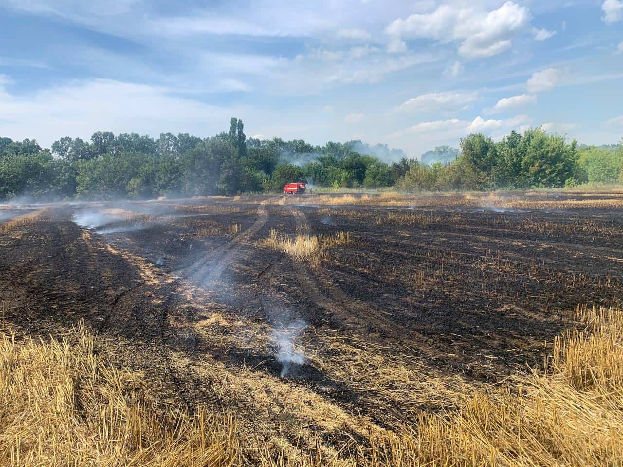 О 14:30 пожежники прибули на місце події та встановили, що горить стерня та чагарники на площі 0,4 га (загальна площа поля – 16 га). До гасіння залучено два трактори сільського господарства.