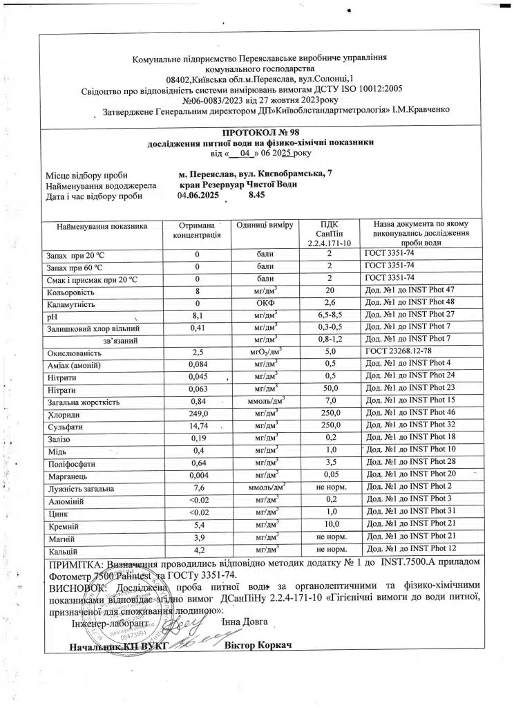 Визначення проводилися відповідно методик додатку №1 до INST.7500.A приладом Фотометр 7500 Palintest та ГОСТу 3351-74.