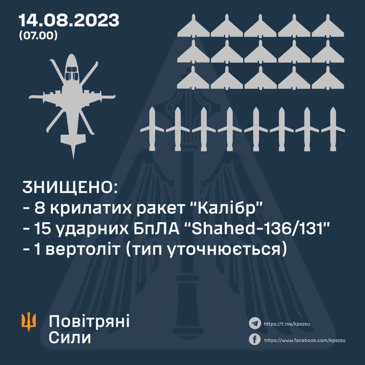 Силами та засобами ППО у взаємодії з підрозділами інших складових Сил оборони усі цілі знищено. Також, близько 05.00 години 14 серпня 2023 року, на Бахмутському напрямку, зенітним ракетним підрозділом Повітряних Сил знищено ворожий вертоліт (тип уточнюється).