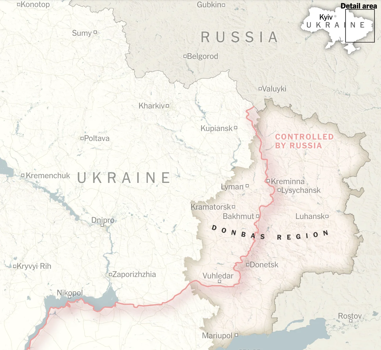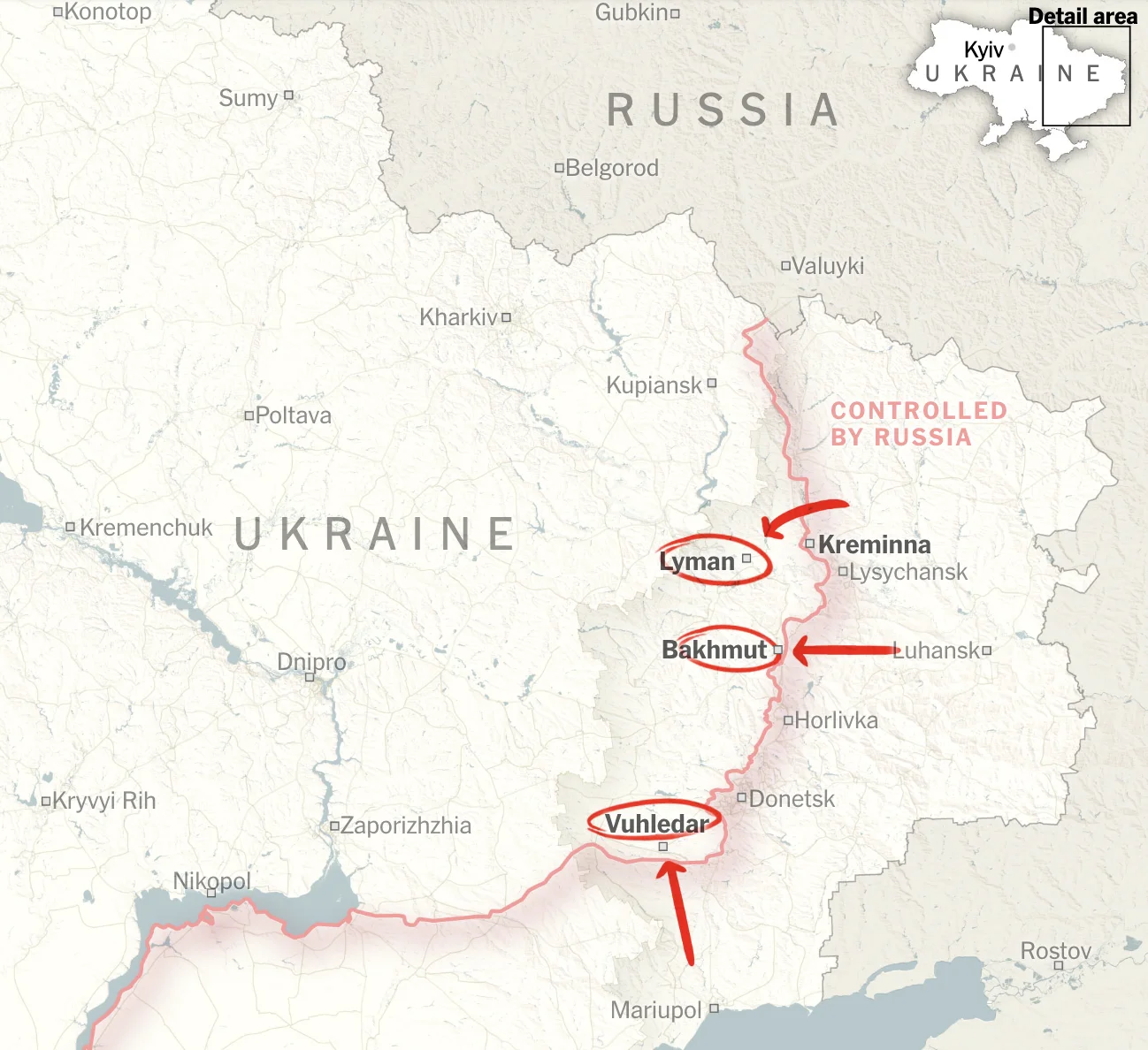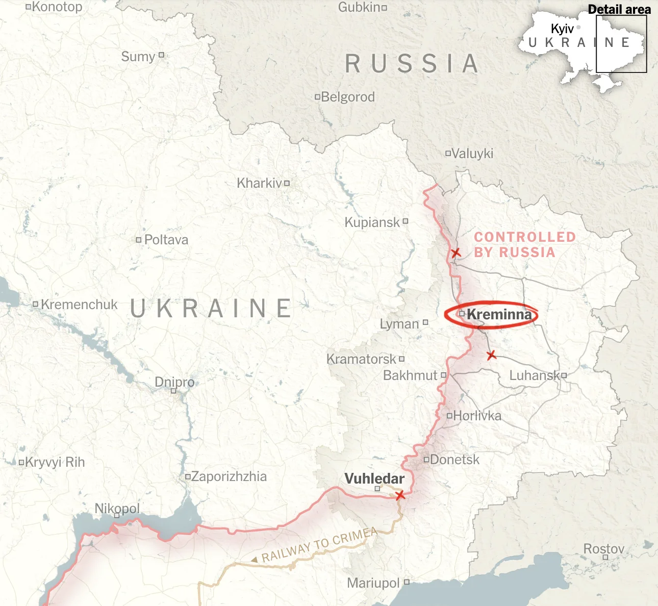 Вони почали жорстоку контратаку, щоб захистити Кремінну, яка розташована на головній магістралі з півночі на південь у Луганську. Він також атакує Вугледар на південному сході, де українські позиції знаходяться лише за кілька миль від єдиного залізничного сполучення з Кримом.