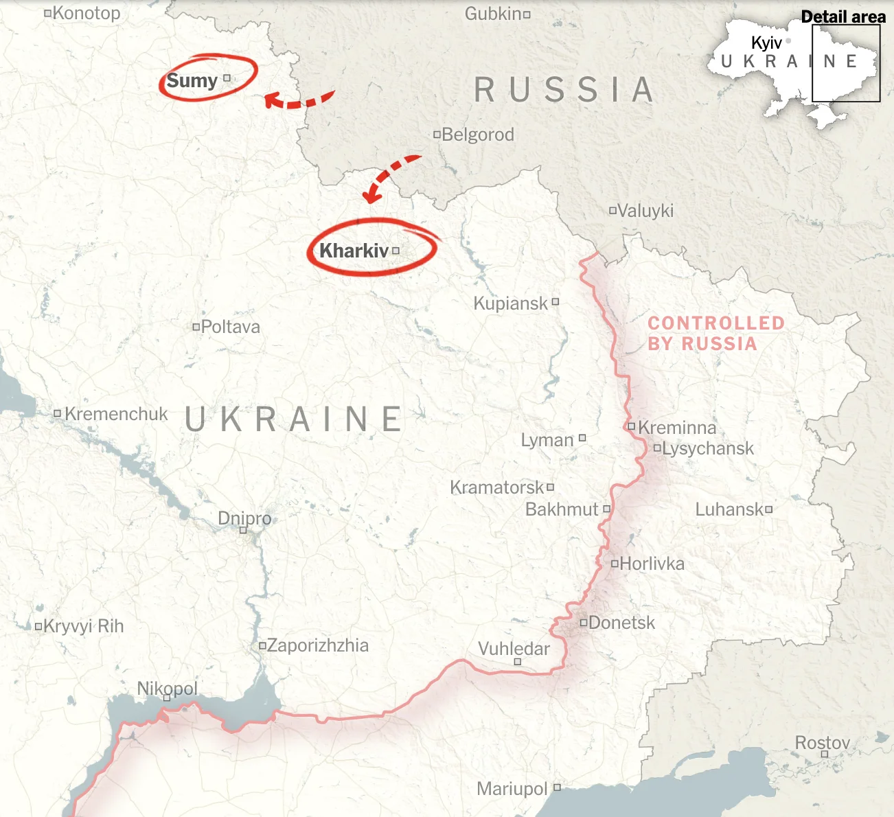 Атака з нового фронту, швидше за все, означала б наближення з території самої Росії, тому українці уважно стежать за рухами навколо прикордонного міста Суми, а також за будь-якими спробами повернутися в Харківську область.