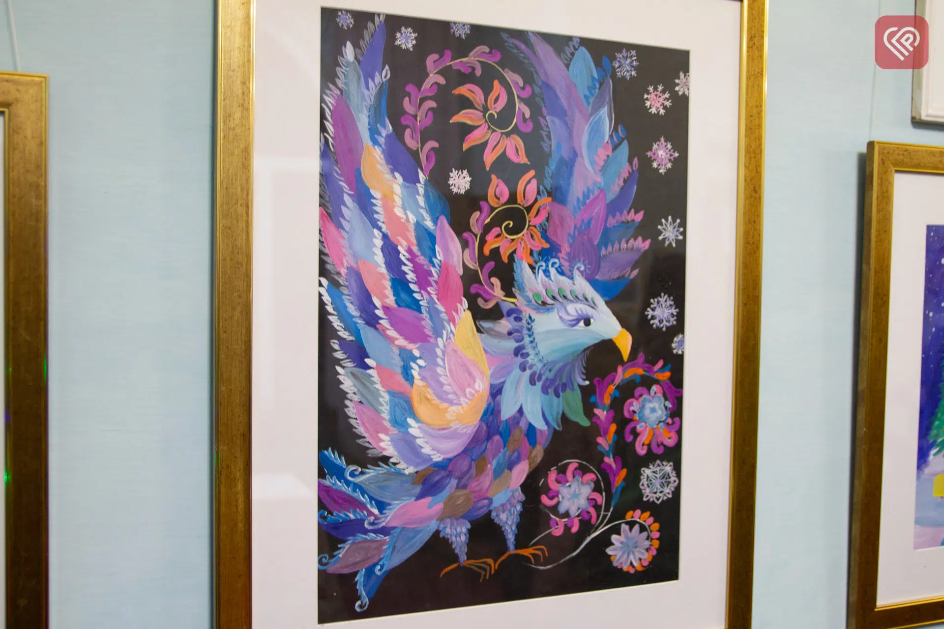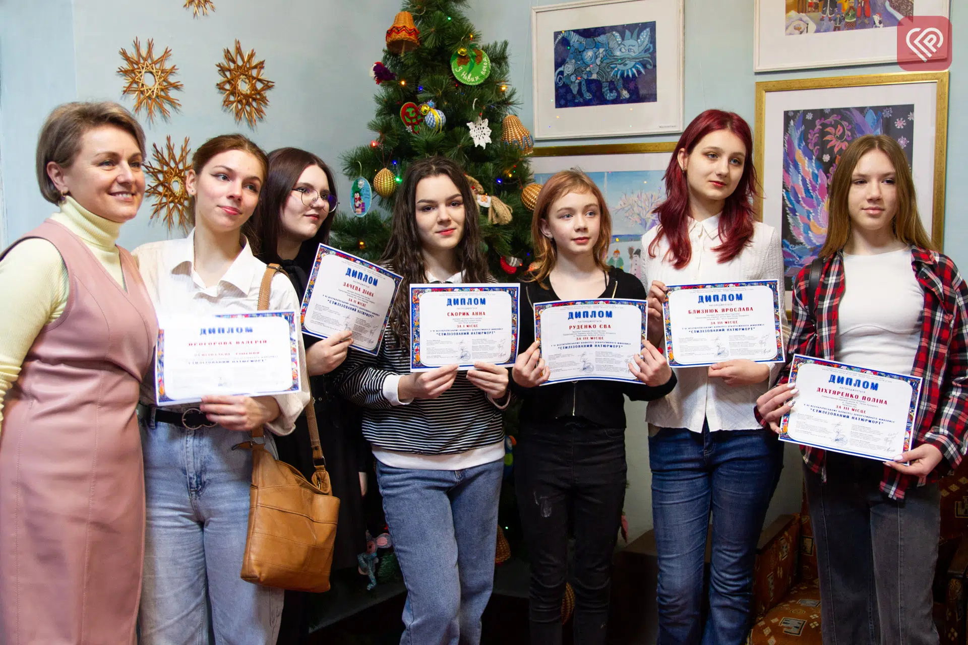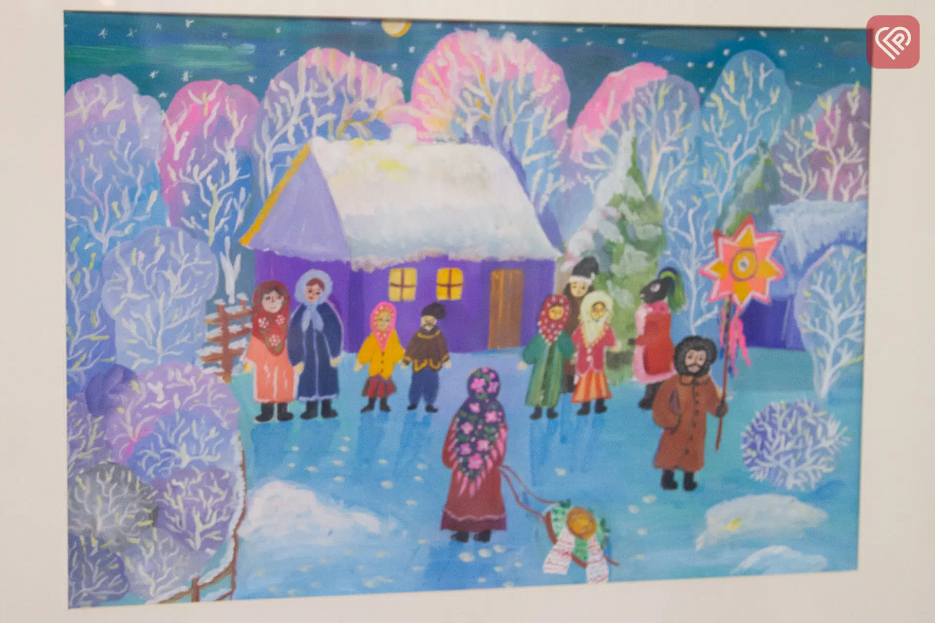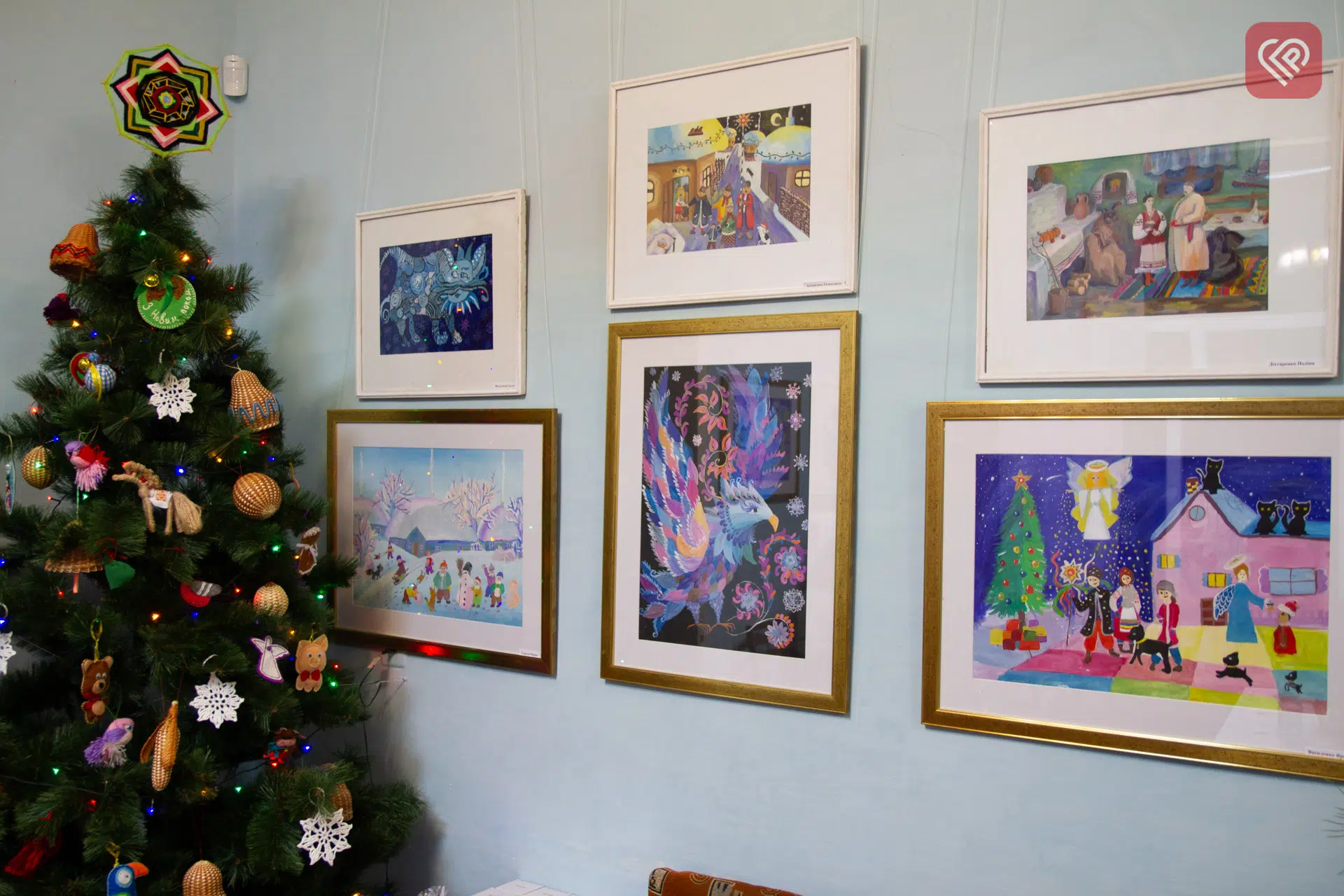 У фойє розмістили роботи на новорічно-різдвяну тематику. Кожен малюнок – окрема чарівна історія. Вкриті пухким мерехтливим сніжком будиночки, гурт колядників, який віщує, що над Вифлеємом зійшла перша зірка, щаслива родина біля ялинки, веселі діти, що бавляться у снігу, тихий зимовий вечір…