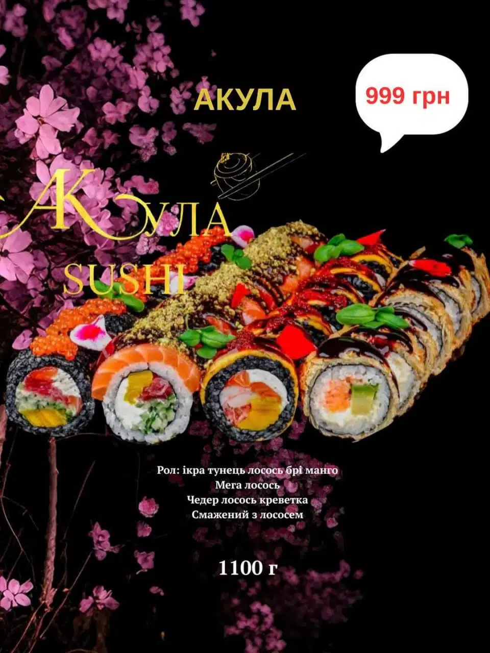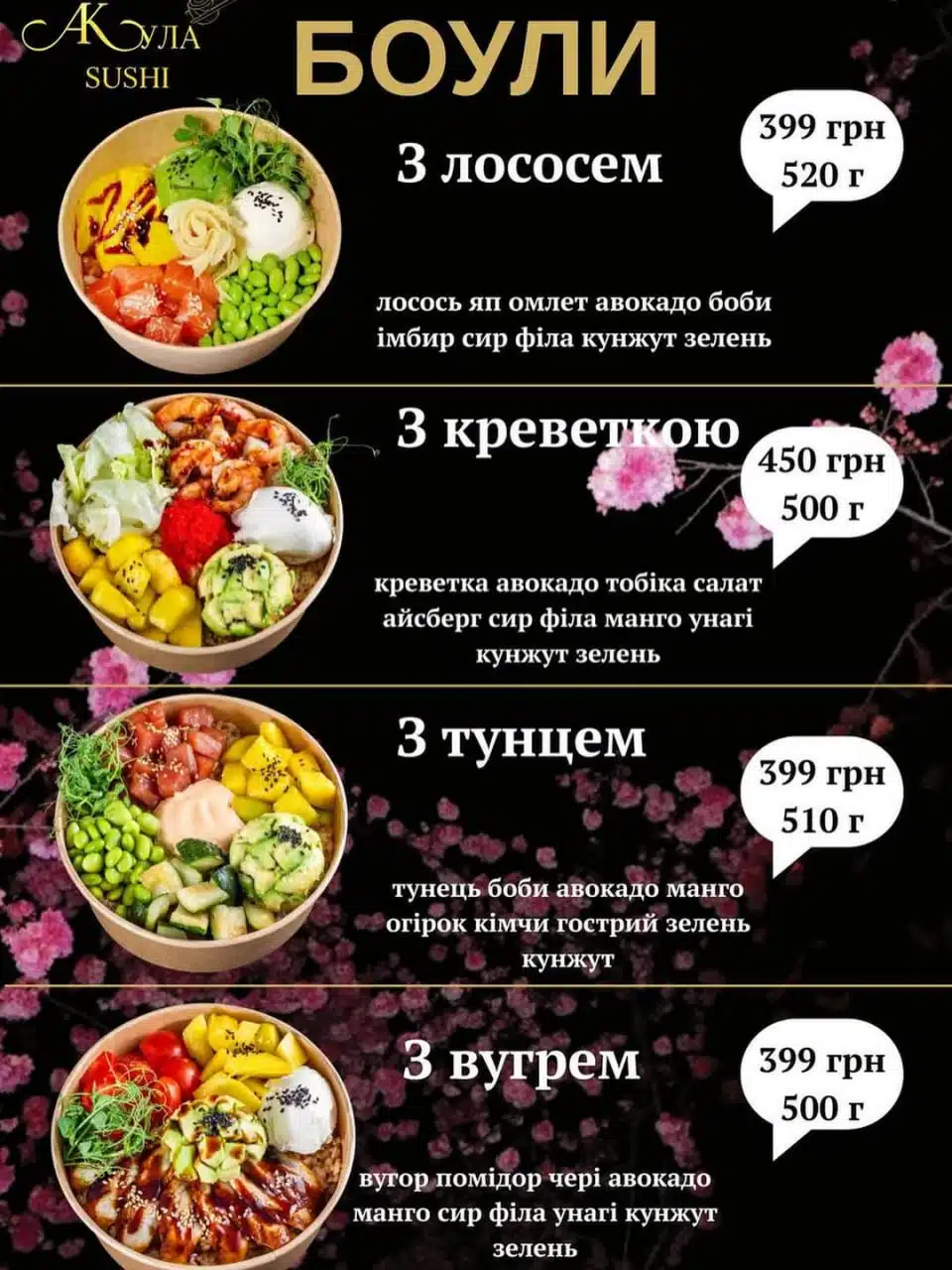 В АКула SUSHI пропонують боули з лососем, креветками, тунцем та вугрем. До складу входять рис, авокадо, сир, японський омлет, боби, зелень і навіть манго. Використовуються лише свіжі продукти найвищої якості. Кожен боул важить близько пів кілограма – щедра й поживна порція.