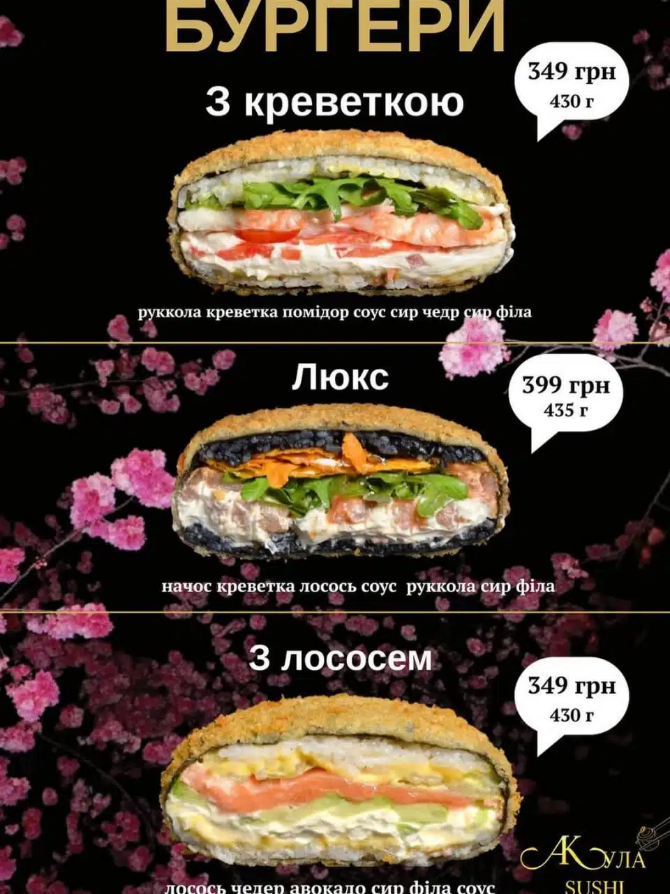 В АКула SUSHI також можна скуштувати цю страву: на шар рису викладають рибу чи морепродукти, овочі та соус, накривають другим шаром рису, загортають у норі, обвалюють у сухариках і обсмажують у фритюрі. Бургер виходить хрустким зовні та соковитим усередині – поєднання японської традиції та західного формату подачі.