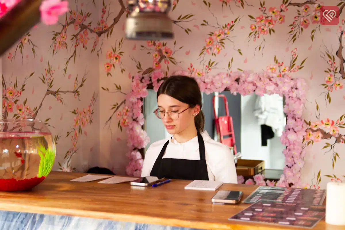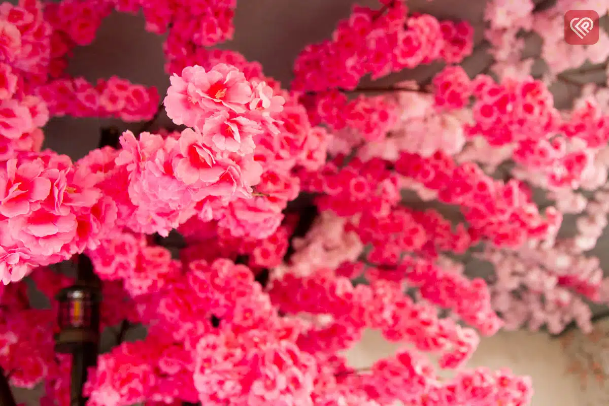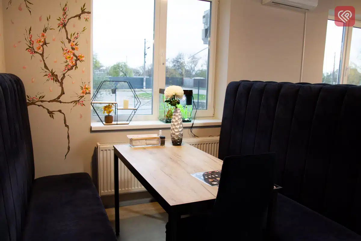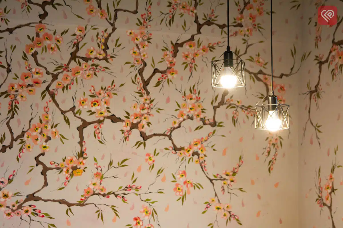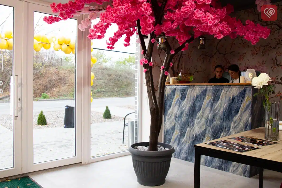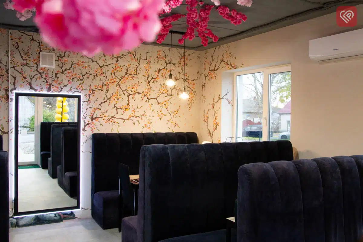 Центральна окраса інтер’єру – штучна сакура майже в натуральну величину, прикрашена ліхтариками. А квіткові візерунки на стінах розписані вручну художницею Віолетою Бойко.
