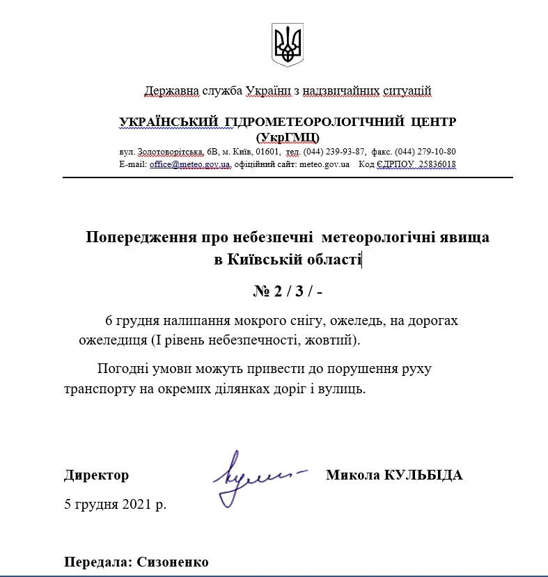 Як повідомляє УКРАЇНСЬКИЙ  ГIДРОМЕТЕОРОЛОГIЧНИЙ  ЦЕНТР, 6 грудня, на території Київської області можливі налипання мокрого снігу, ожеледь на дорогах (І рівень небезпечності, жовтий).
