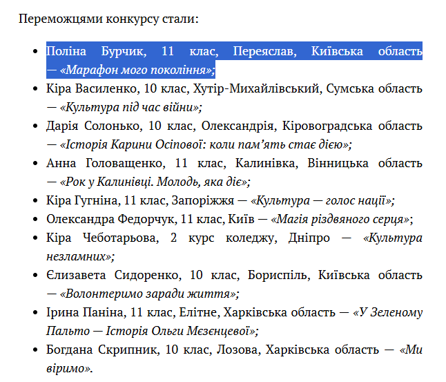 Учениця Переяславського академічного ліцею імені Івана Мазепи, волонтерка МЦ «Зустріч» та членкиня Молодіжної ради Переяславської громади Поліна Бурчик зі своїм відео про молодість під час війни та силу поколінь стала переможницею національного конкурсу учнівських відеосюжетів «Репортер». Її роботу було обрано до десятки кращих з понад півтори сотні відео, і нині вона поділилася з Proslav своїми враженнями від участі і церемонії нагородження.