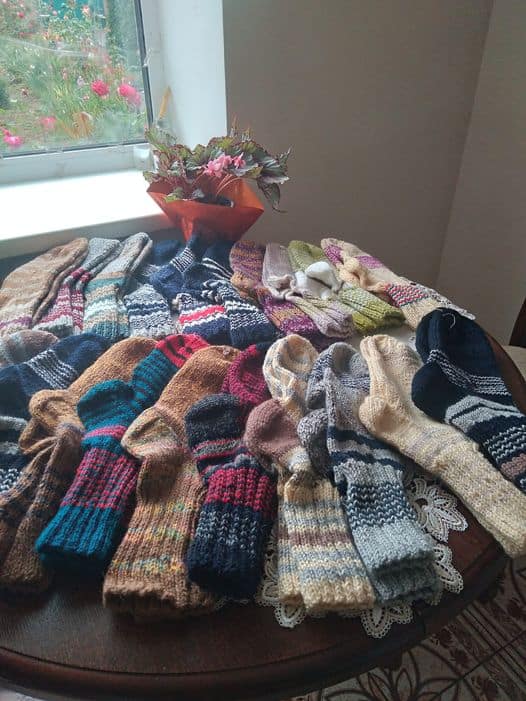 «Наші захисники вже відчувають нічну прохолоду в окопах і бліндажах та конче потребують нашої підтримки, бодай, теплими шкарпетками. На світлині – вовняні шкарпетки, які дбайливо виготовила Ніна Семенівна. Але це далеко не всі, їх було значно більше! Ніна Семенівна принципово не використовує синтетичні нитки, які не горять, а плавляться… Вона розплутує вовняні речі, потім пере і прасує нитки, щоб були м’які і рівні, і аж після цього в’яже шкарпетки. Скільки любові, материнської турботи і величезної праці у кожній такій парі!»