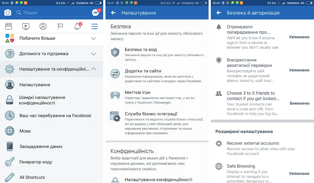 Шляхи увімкнення двофакторної авторизації в мобільному додатку Facebook та на сайті соцмережі дещо відрізняються, але з 2019 року розробники працюють над уніфікацією інтерфейсів, наскільки це можливо. Станом на березень 2019, Ви можете отримати доступ до Ваших налаштувань конфіденційності на мобільному додатку як на iOS, так і на Android, натиснувши на значок три горизонтальні смужки у верхньому правому куті і прокрутивши вниз, щоб знайти меню налаштувань і конфіденційності. Натисніть «Налаштування» (іконка-шестерня) — «Безпека та вхід». Опція двофакторної аутентифікації буде доступна в розділі «Налаштування додаткової безпеки».