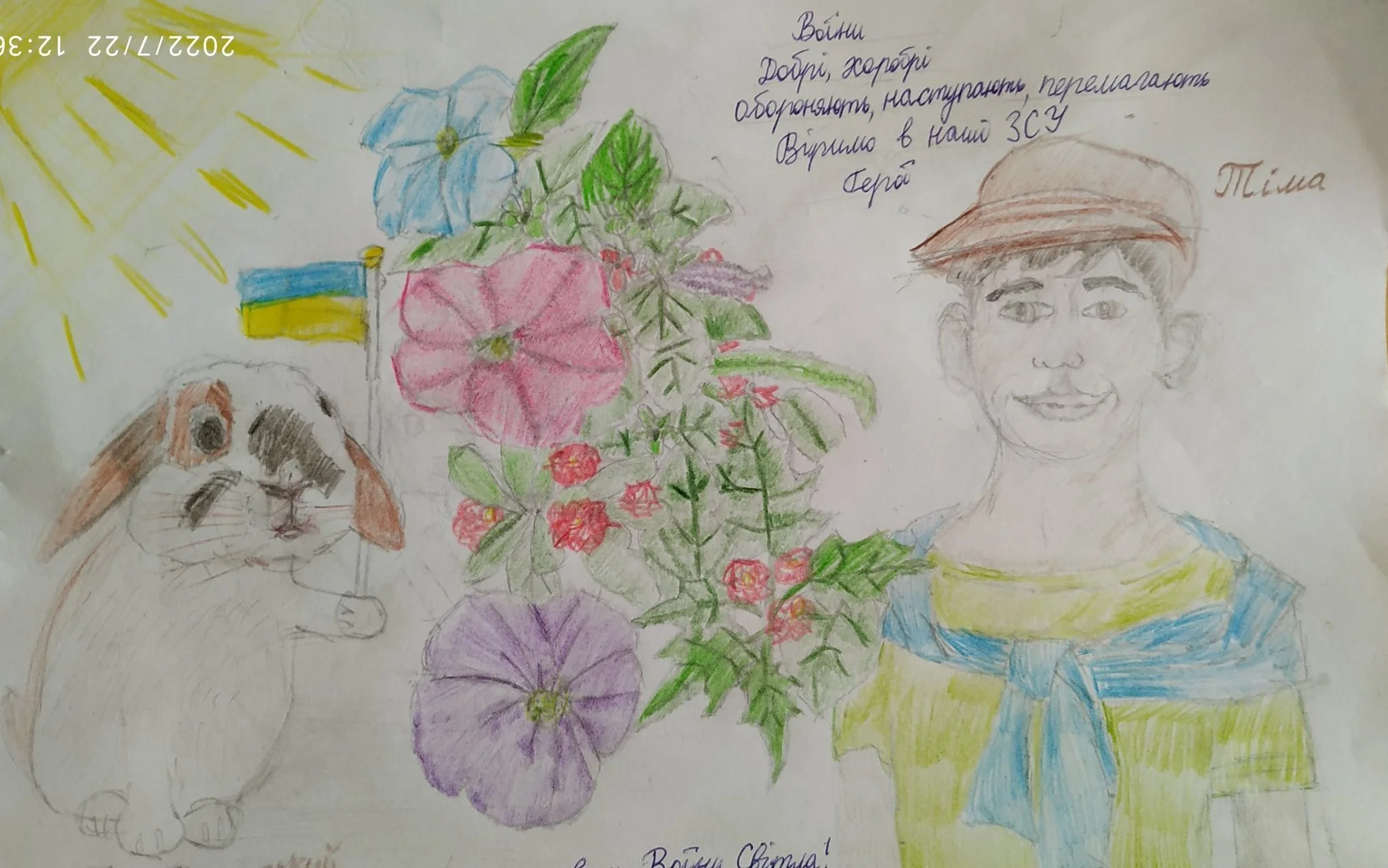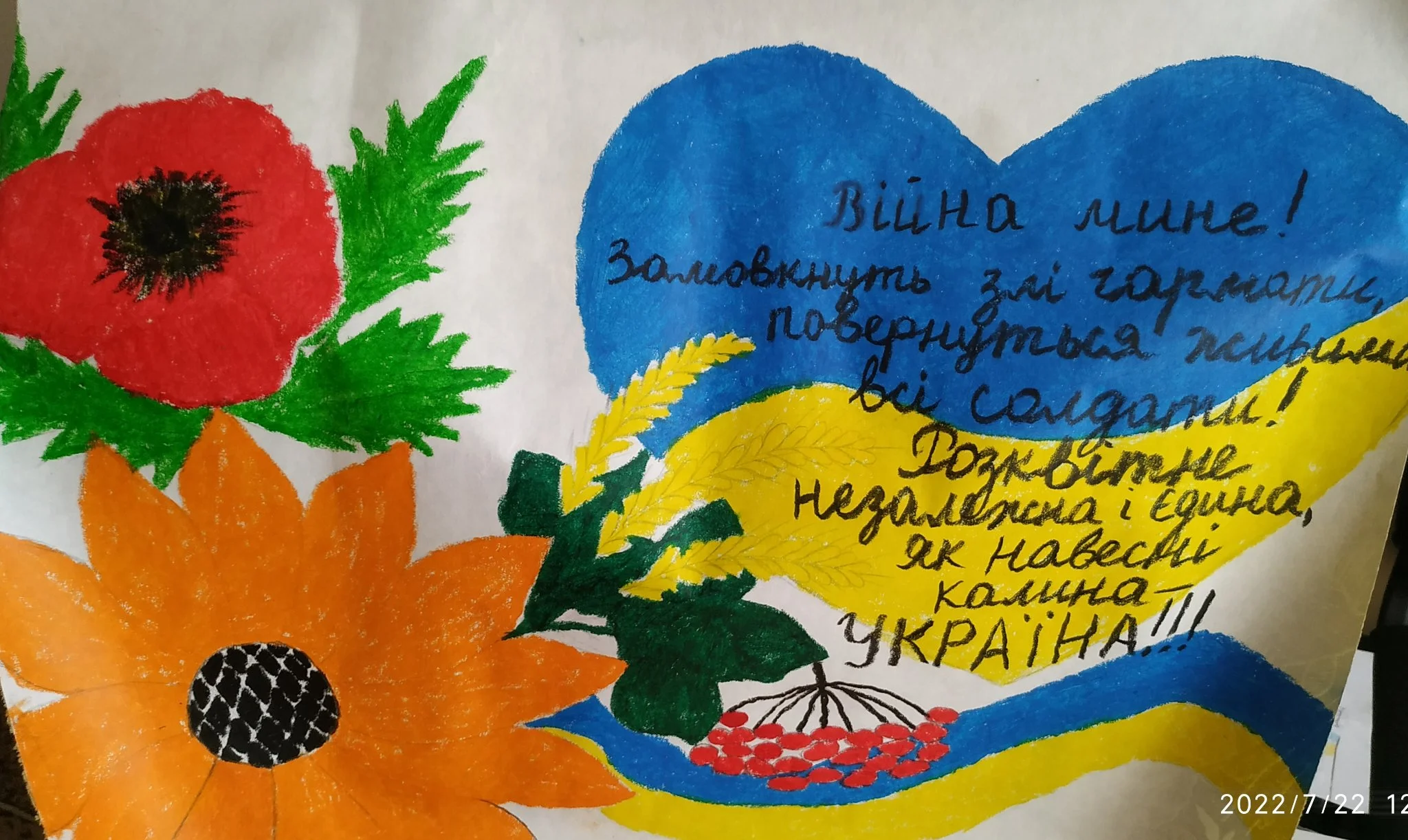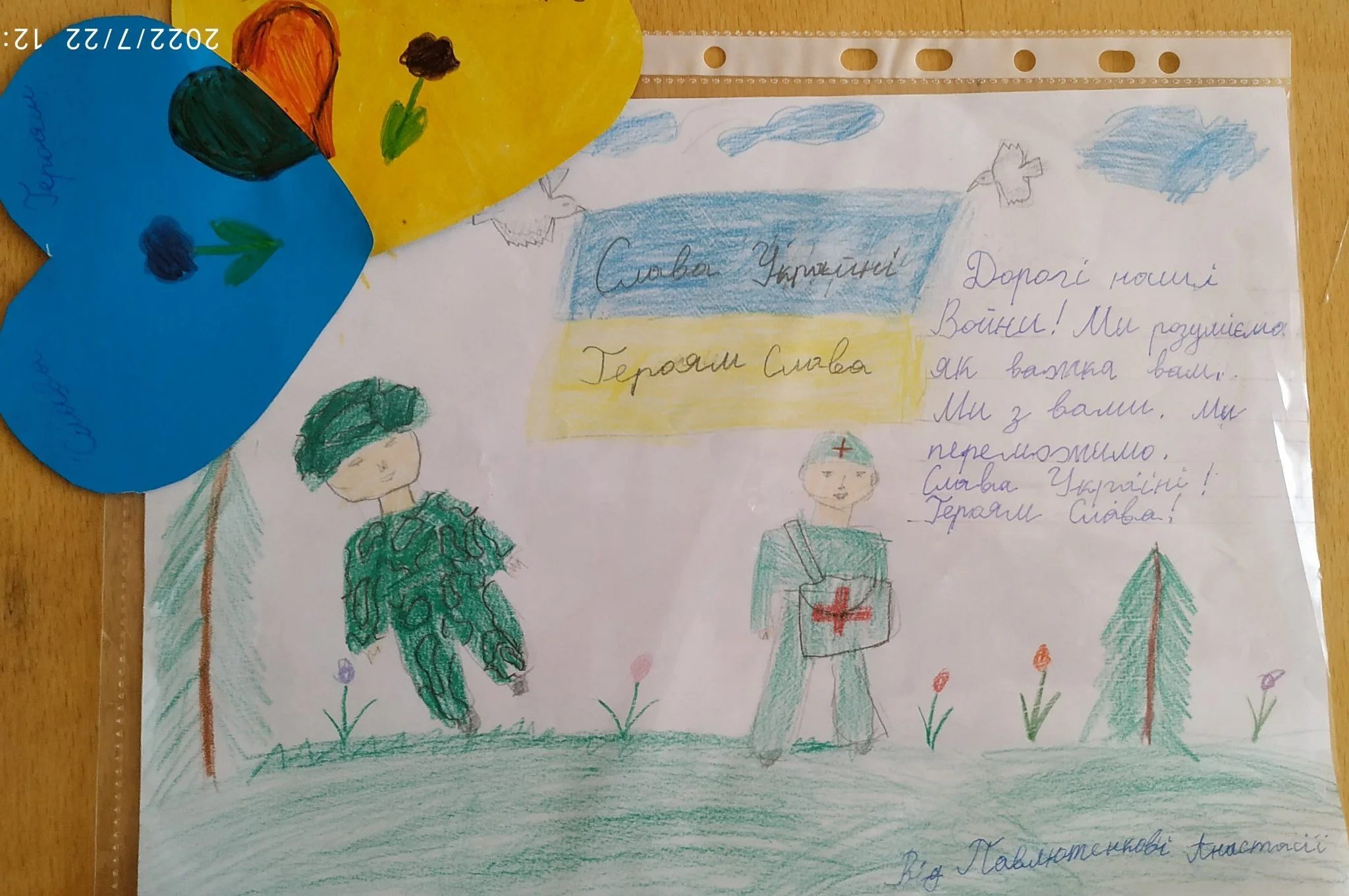 Цього разу ми просили намалювати малюнок та, за бажанням, написати кілька теплих слів нашим воїнам-захисникам. Малюнки необхідно було принести до школи та залишити у приймальній директора школи або передати волонтерам, які плетуть сітки на першому поверсі нашого навчального закладу.