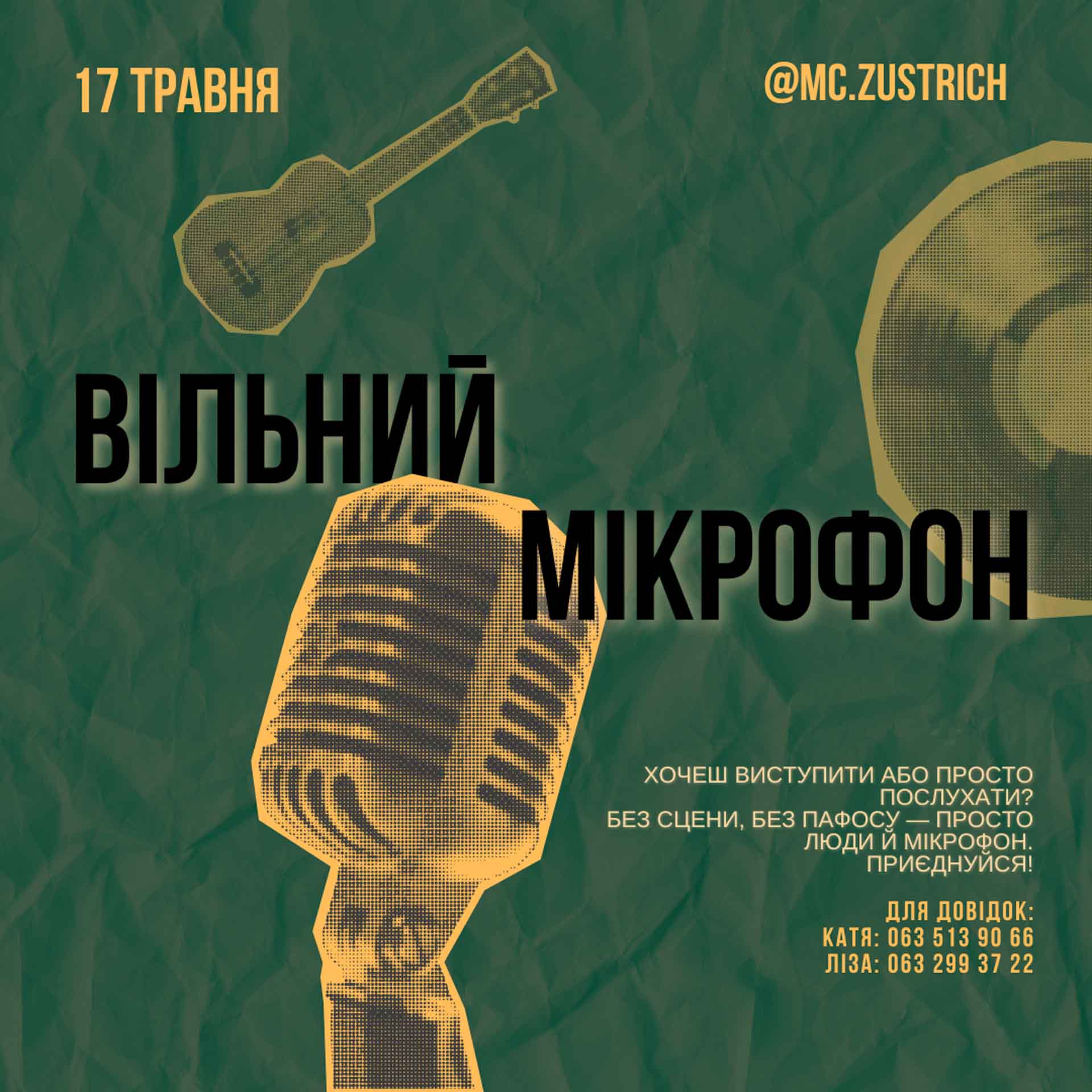 Щоб виступити можна зв’язатися з організаторами через Instagram, перейшовши за посиланням https://www.instagram.com/mc.zustrich. Або ж зателефонувати: