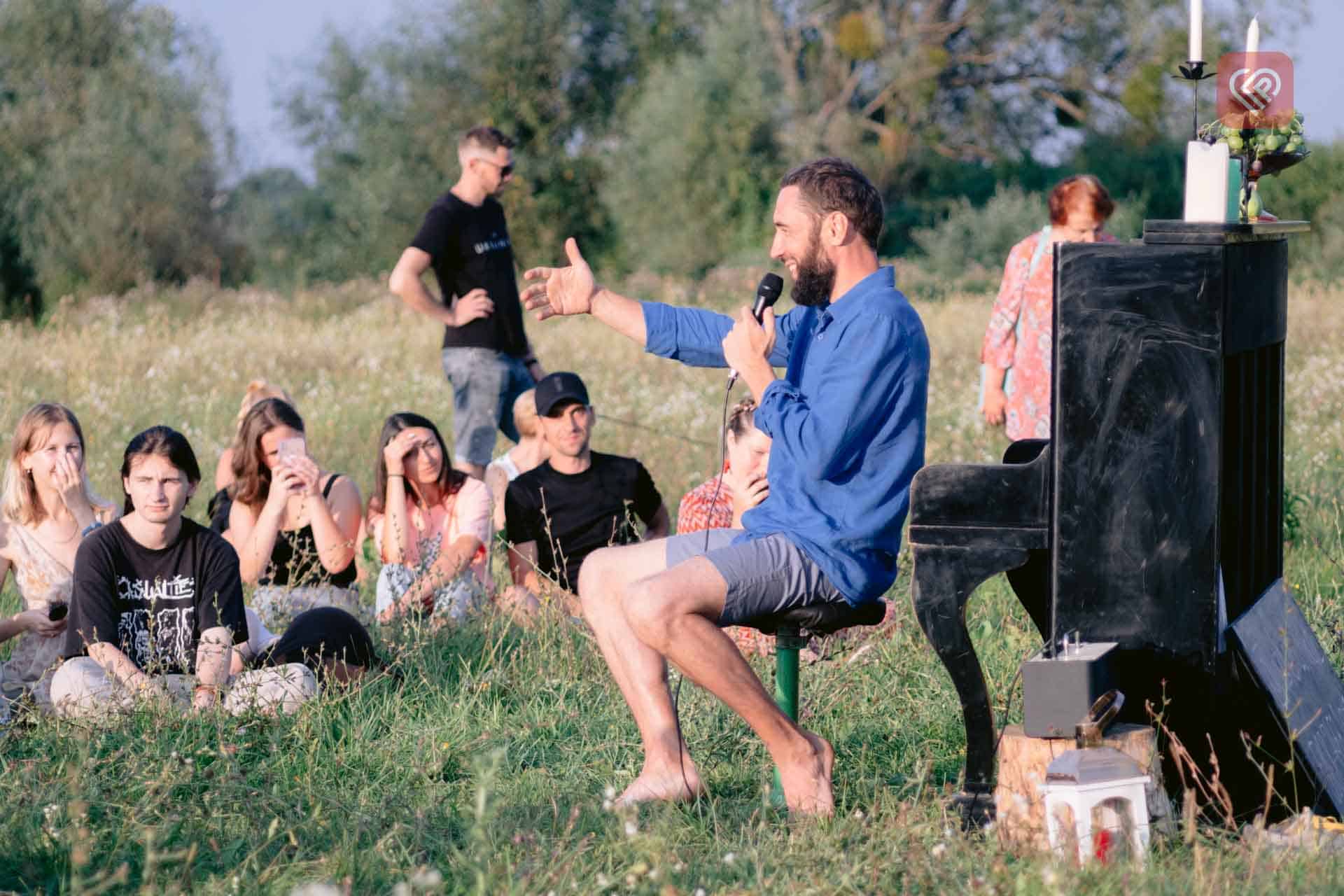 – Чому збираємось саме на полі? Локацію обирали невипадково. Неподалік мій дім, і багато яскравих дитячих спогадів пов’язані з цим місцем. Тут ми відзняли перший кліп на мою авторську композицію «Поле Марі», про любов до життя, музики, рідного краю, жінки. Художниця Марина Панкевич, якій я показав ці краєвиди, а згодом і присвятив твір, подарувала мені нові асоціації, тому поле для мене – дуже особливе місце. Марина зобразила його на листівках. І хоч сама вона не змогла бути присутня сьогодні, передала маленькі сюрпризи для всіх присутніх.