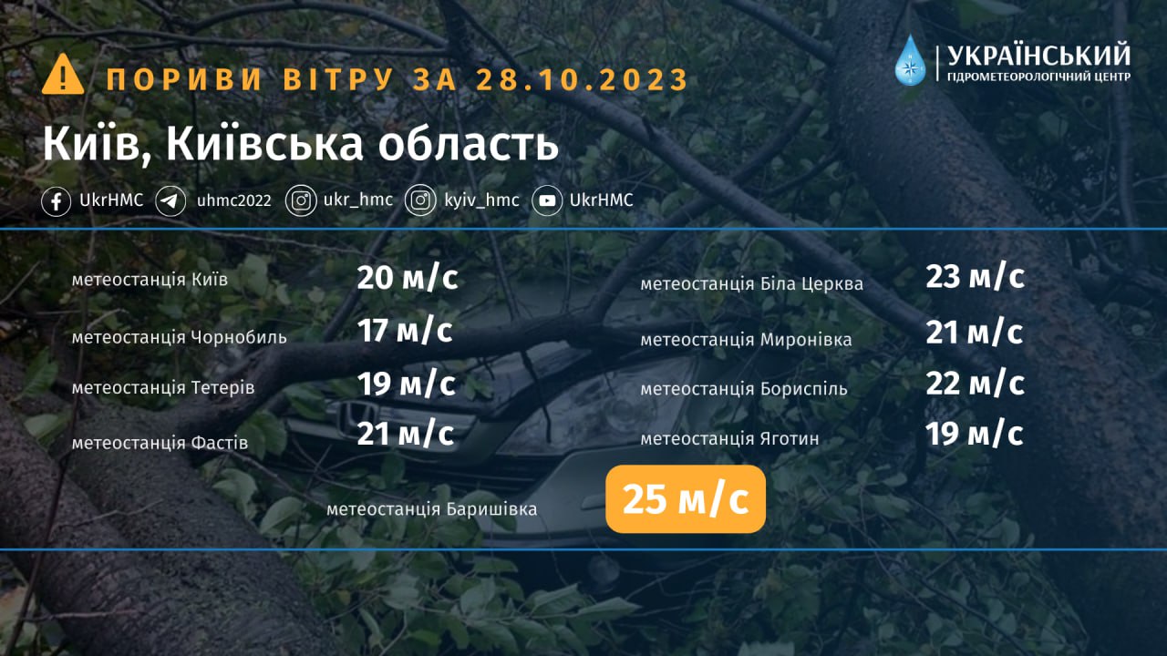 Водночас, за даними спостережень Центральної геофізичної обсерваторії імені Бориса Срезневського, 28 жовтня у столиці максимальна швидкість вітру досягла рекордних 20 м/с (72 км/год), що повторило попереднє максимальне значення для цього дня, зареєстроване у 1969 році.