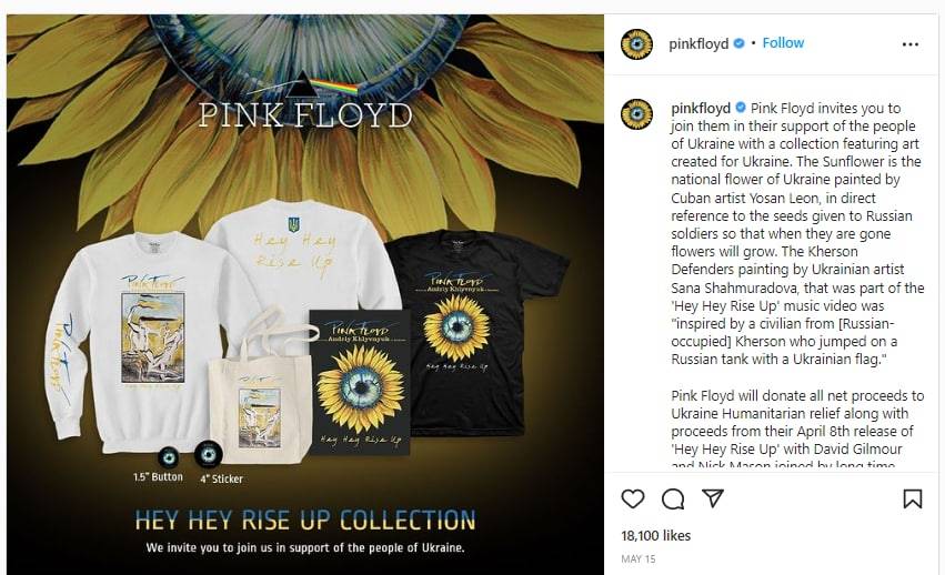 Гурт також зазначив: «Pink Floyd запрошує вас долучитися до підтримки українського народу з колекцією творів мистецтва, створених для України». Придбати вподобані речі можна за посиланням.