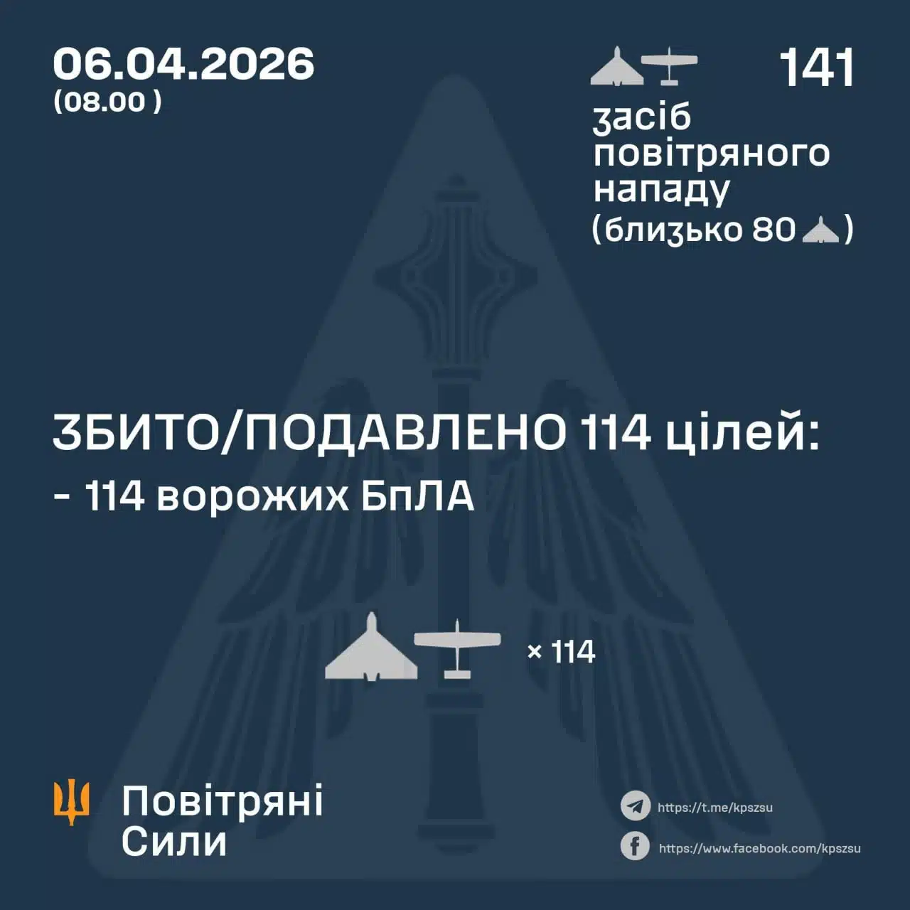 Загалом у ніч на 6 квітня (починаючи з 18:00 напередодні) російські війська здійснили масовану атаку на Україну, застосувавши 141 ударний безпілотник. Про це повідомляє командування Повітряних Сил ЗСУ.