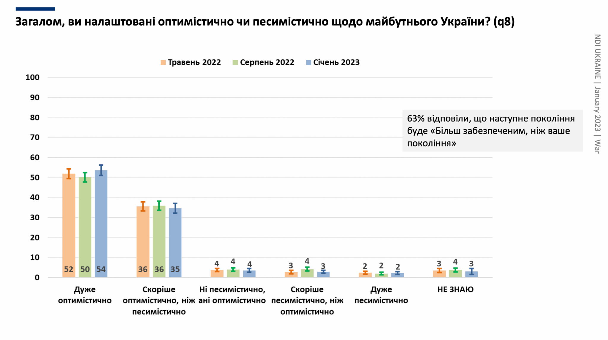 Більша частина (54%) українців дуже оптимістично налаштовані щодо майбутнього України. 35% – скоріше оптимістично, ніж песимістично.