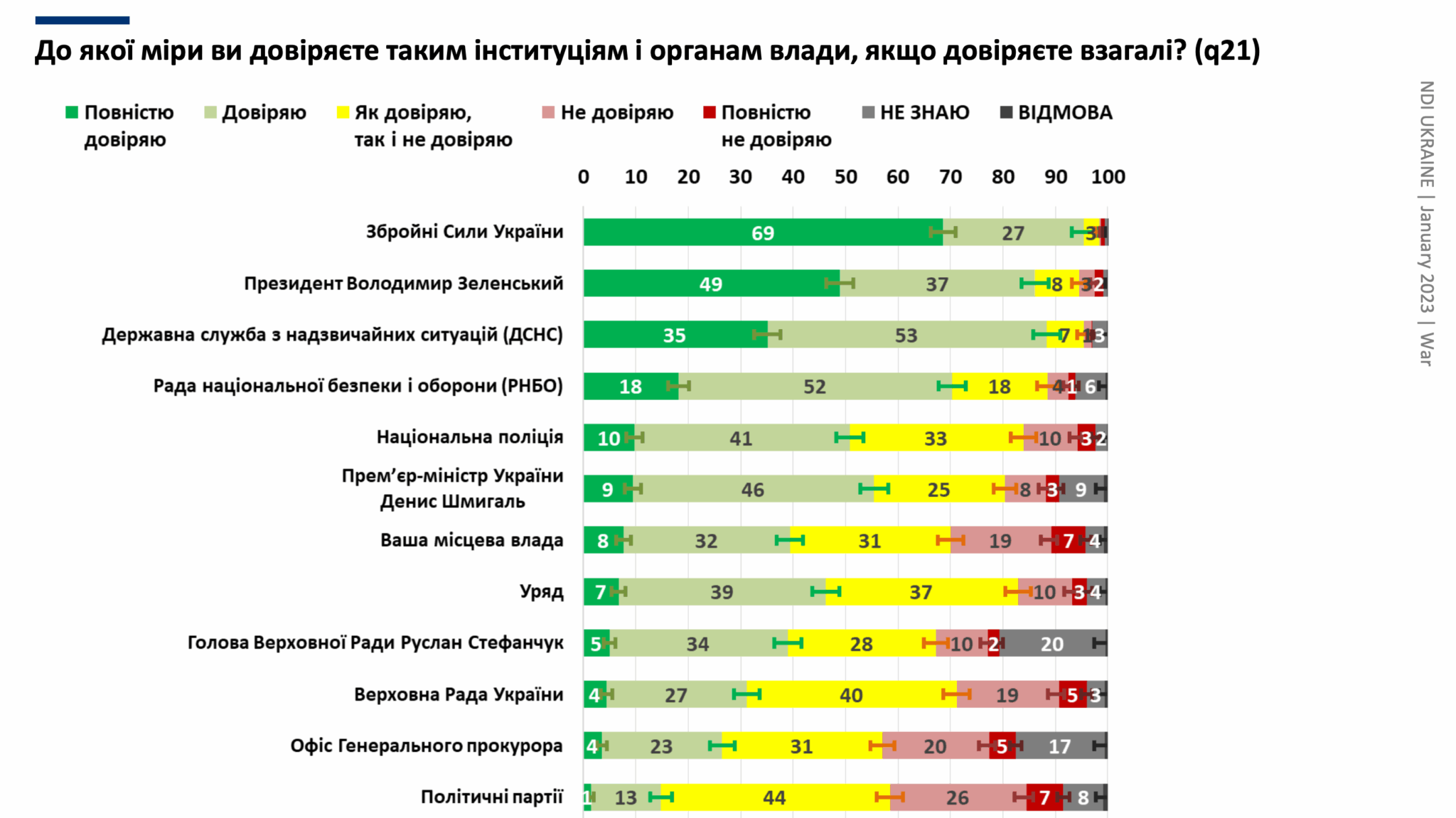 За результатами опитування, українці найбільше довіряють Збройним Силам України, Президенту Володимиру Зеленському та ДСНС.