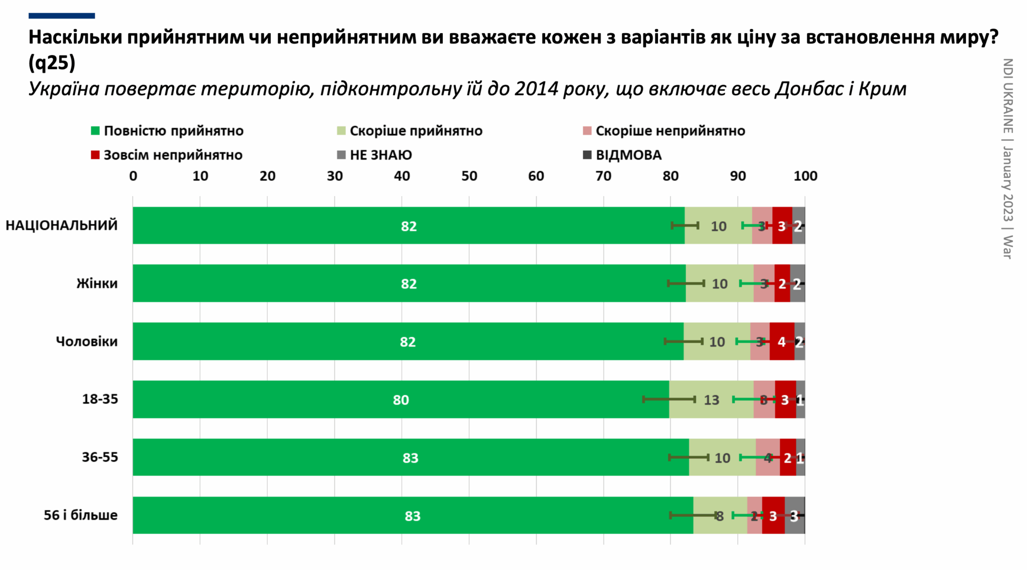 92% українців вважають прийнятним встановлення миру шляхом повернення територій, підконтрольних Україні до 2014 року, що включають весь Донбас і Крим.