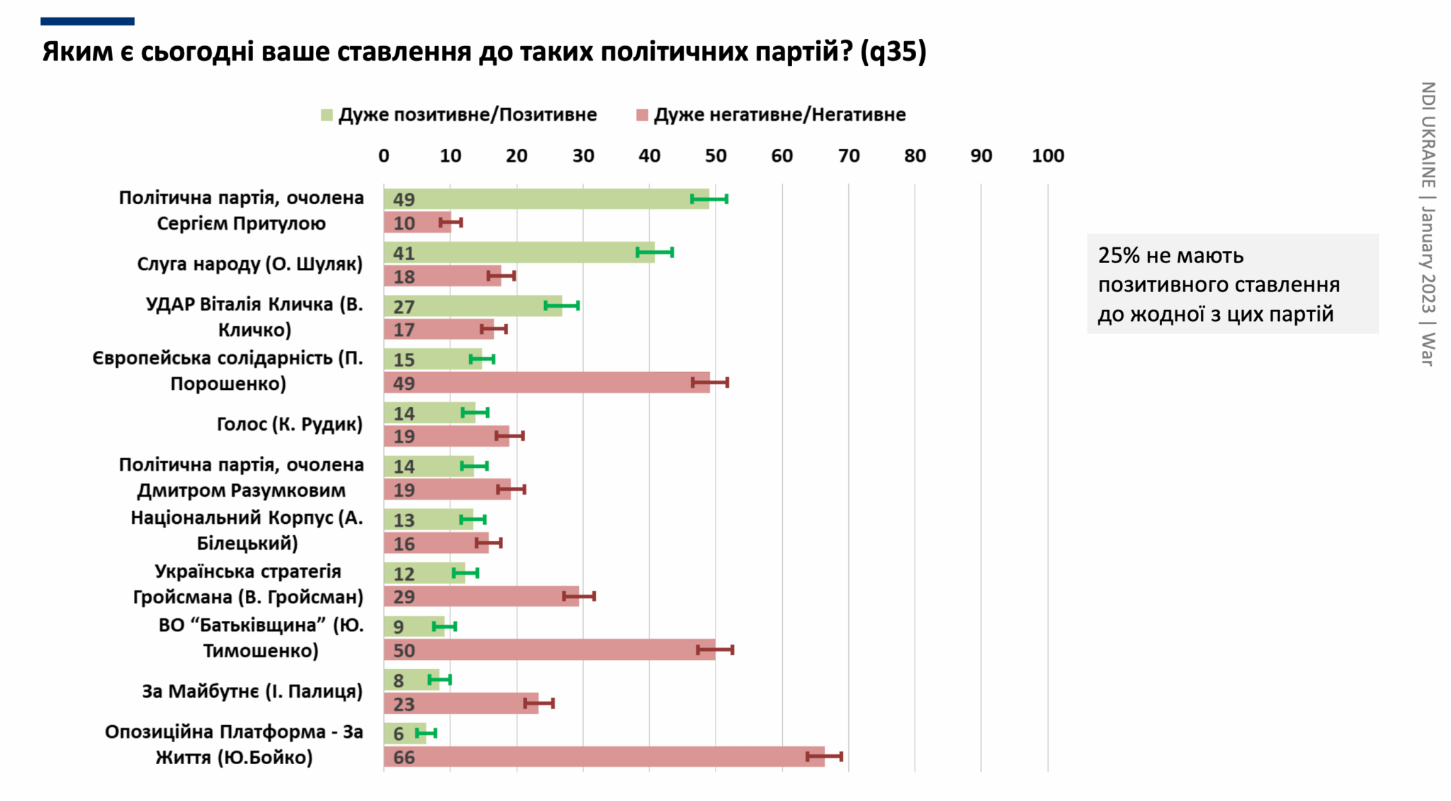 Українці найбільш позитивно ставляться до політичної партії очоленої Сергієм Притулою, партії Слуга Народу та партії Удар. Більш ніж половина негативно ставляться до ВО “Батьківщина” (Ю. Тимошенко) та ОПЗЖ.