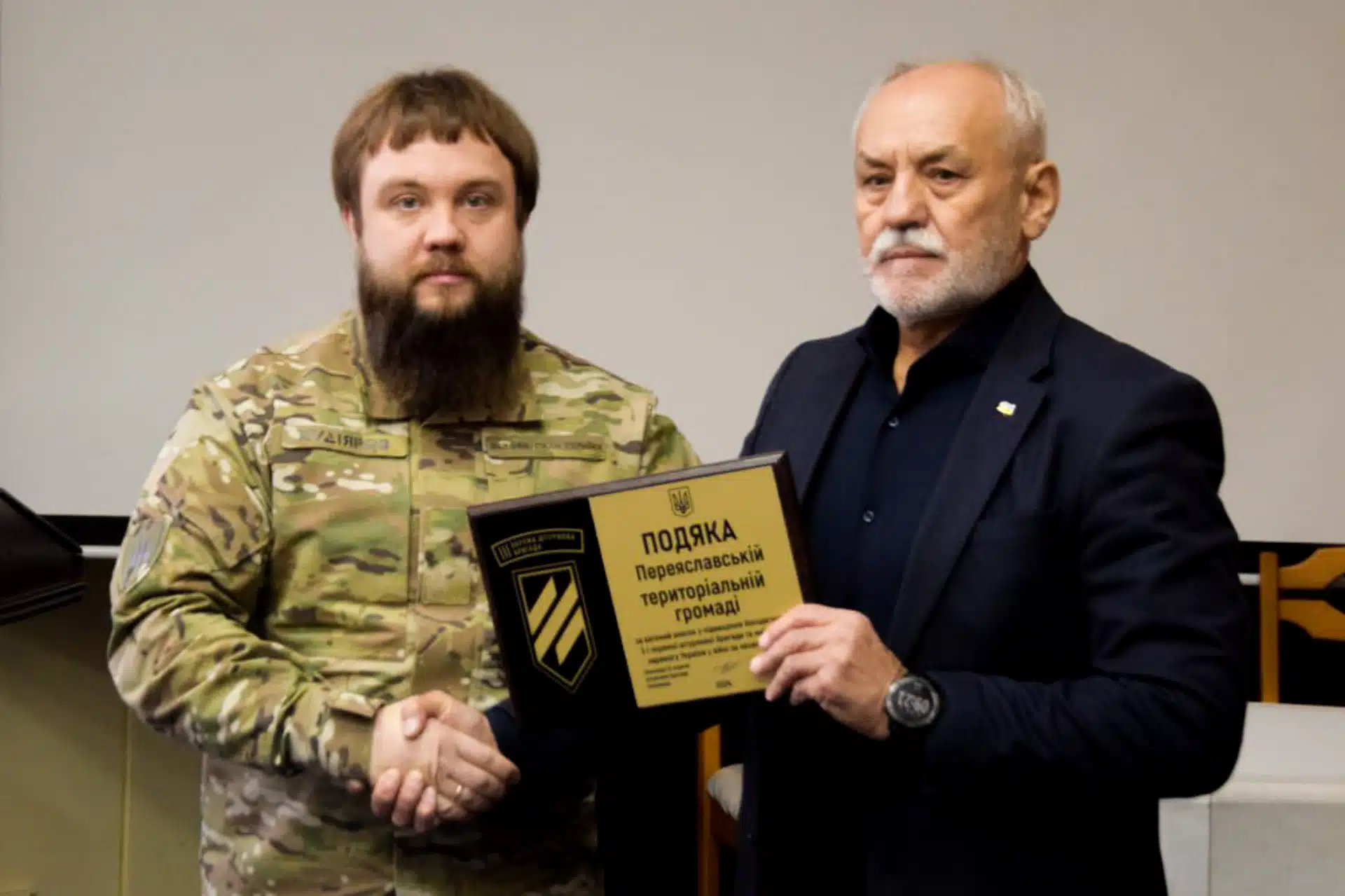 Вадим Кудіяров подякував за ефективну співпрацю щодо забезпечення підрозділу, всебічну інформаційну підтримку та міцний тил і вручив міському голові Вячеславу Саулку Подяку Переяславській територіальній громаді від командира 3-ї ОШБ полковника Андрія Білецького за вагомий внесок у підвищення боєздатності підрозділу.