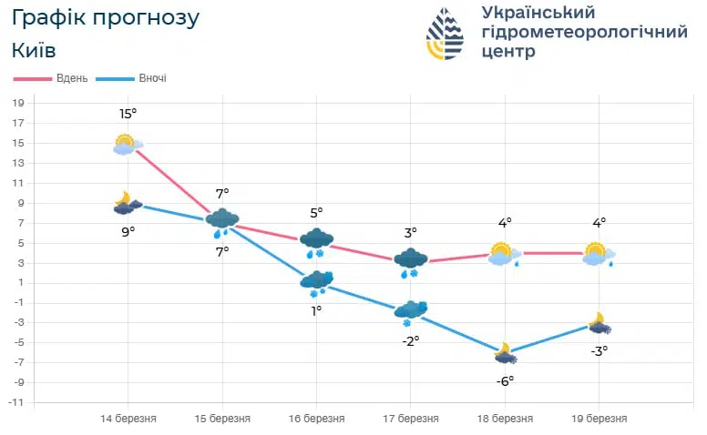 Водночас у гідрометцентрі попередили про зміну погодних умов на Київщині у період з 15 по 19 березня.