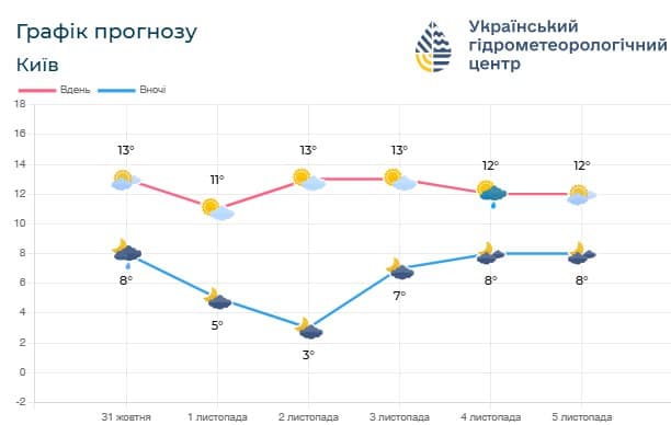 За прогнозом Українського гідрометцентру, з 1 по 5 листопада в столиці та області пануватиме переважно суха і сонячна погода. На цей період очікується вплив області високого атмосферного тиску, тому опадів практично не буде.