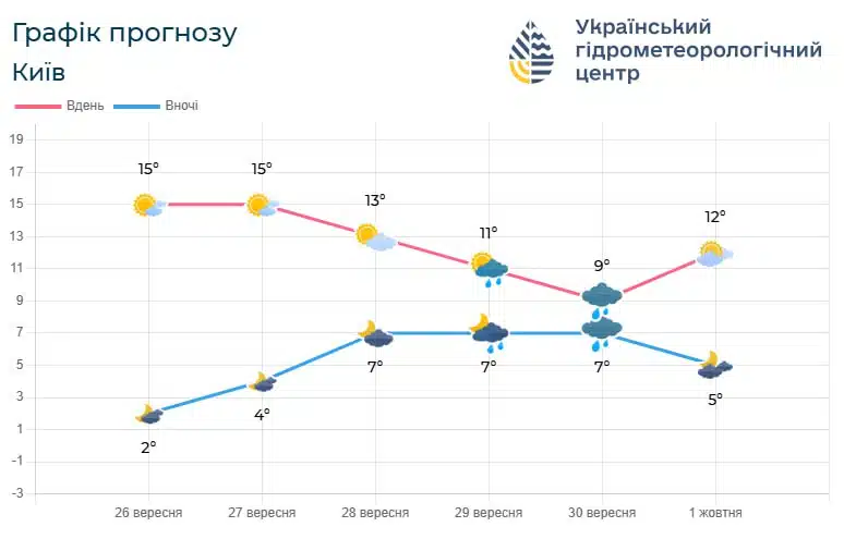 28 вересня атмосферний фронт принесе хмарність та місцями невеликі дощі у денний час. 29-30 вересня синоптики прогнозують збільшення кількості опадів та хмарності. Ночі стануть теплішими, однак денна температура дещо знизиться.
