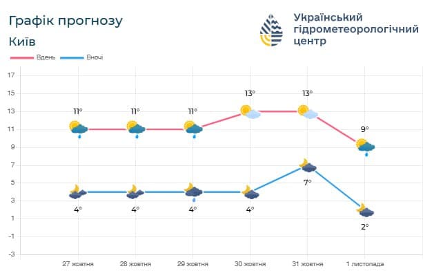 Температура вночі на Київщині складе 1-6°, а вдень стовпчики термометрів піднімуться до 8-13° осіннього тепла. У столиці вночі температура буде у межах 3-5°, у денні години варто розраховувати на незначні 10-12° тепла.