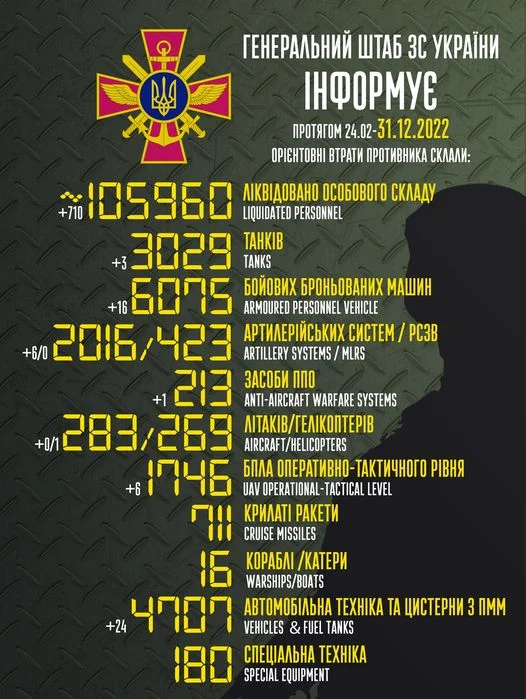 Станом на ранок 31 грудня загальні втрати загарбників склали: