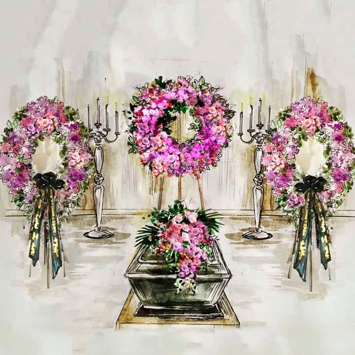 Декорації для похоронних церемоній можуть бути різноманітні: вінки, букети, гробові прикраси, квіткові композиції на столи чи підлогу. Вони додають особливого шарму та виразності урочистому заходу, створюючи атмосферу спокою та поваги до пам’яті покійного.