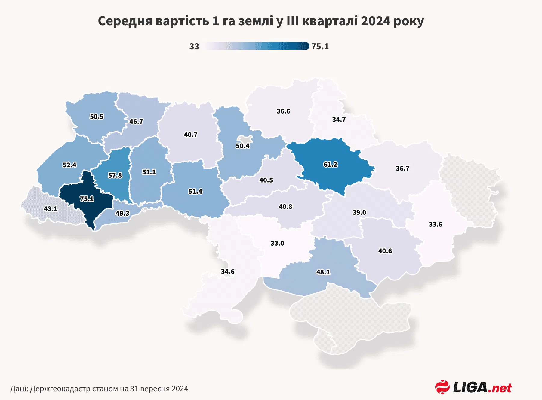Середня вартість гектара по Україні — понад 45 тисяч гривень, що на 4% більше, ніж у другому кварталі. Найдорожчою залишається СГ земля в Івано-Франківській області — 75 000 гривень за гектар. У Херсонській області, навпаки, найнижча середня ціна — 33 000 гривень.