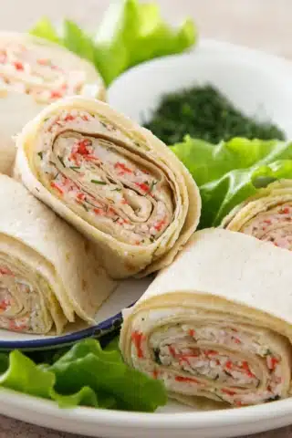 Обережно, але щільно скрутіть лаваш у рулет. Загорніть його в харчову плівку та поставте в холодильник щонайменше на 30 хвилин, щоб рулет добре тримав форму.