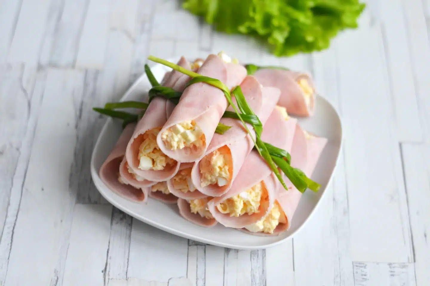 Змастіть кожну скибочку шинки сирною масою й скрутіть у рулетики. Пір’їнки цибулі занурте в окріп на 10 секунд – так вони стануть м’якими. Перев’яжіть кожен рулетик цибулею і подавайте.