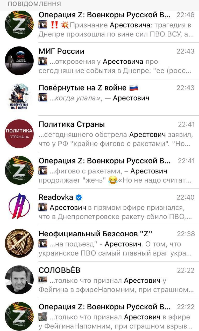 Так, у нещодавному ефірі на каналі російського блогера Марка Фейгіна радник офісу президента Олексій Арестович висловив думку про те, що трагедія у Дніпрі сталась внаслідок роботи української ППО. Мовляв, аби наші ракетні війська не намагались збити ворожу ракету – вбивств можна було б уникнути.