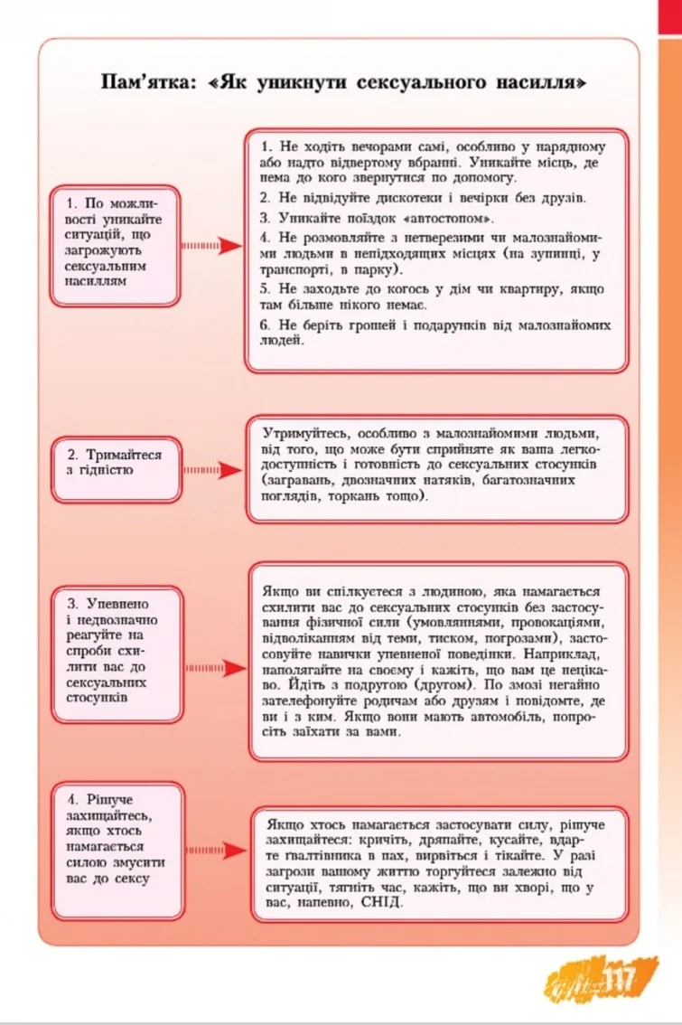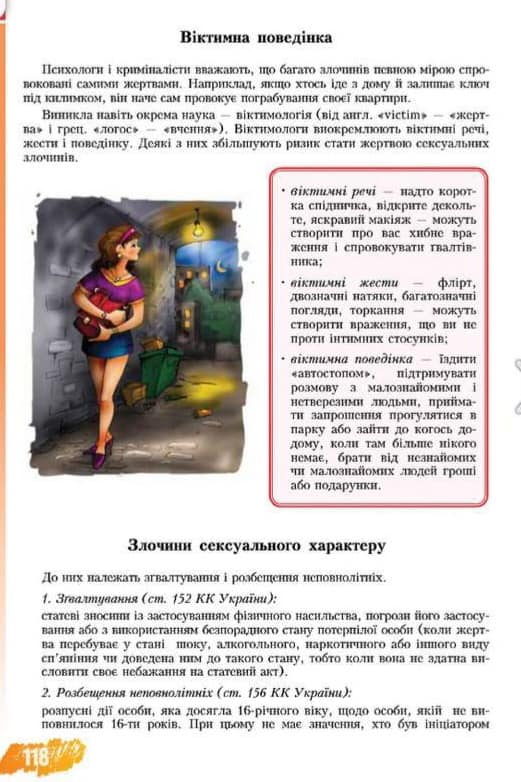 Зокрема, психологиня Катерина Гольцберг звертала увагу на сексизм у підручнику і неправильне трактування авторами «віктимної поведінки» та віктимології як такої. У версії книги за 2016 рік є цілий розділ про речі, жести й поведінку дівчини, які нібито можуть спровокувати на зґвалтування: яскравий макіяж, декольте, коротка спідниця, флірт, дотики, «неоднозначні погляди», «приймати запрошення прогулятися в парку або зайти до когось додому, коли там нікого нема», «брати від незнайомих чи малознайомих людей гроші або подарунки».