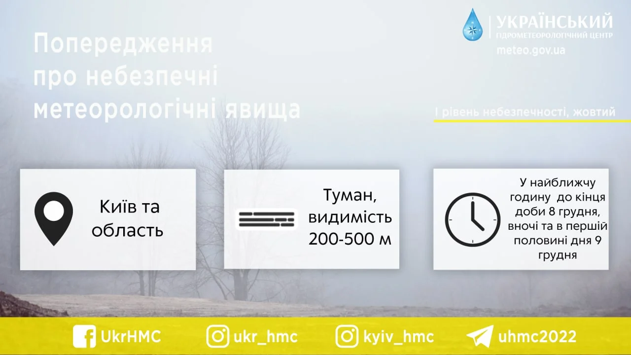 У найближчий час з утриманням до кінця доби 8 грудня та в першій половині дня 9 грудня туман, видимість 200-500 м, I рівень небезпечності, жовтий. Про це попереджає Український гідрометцентр.