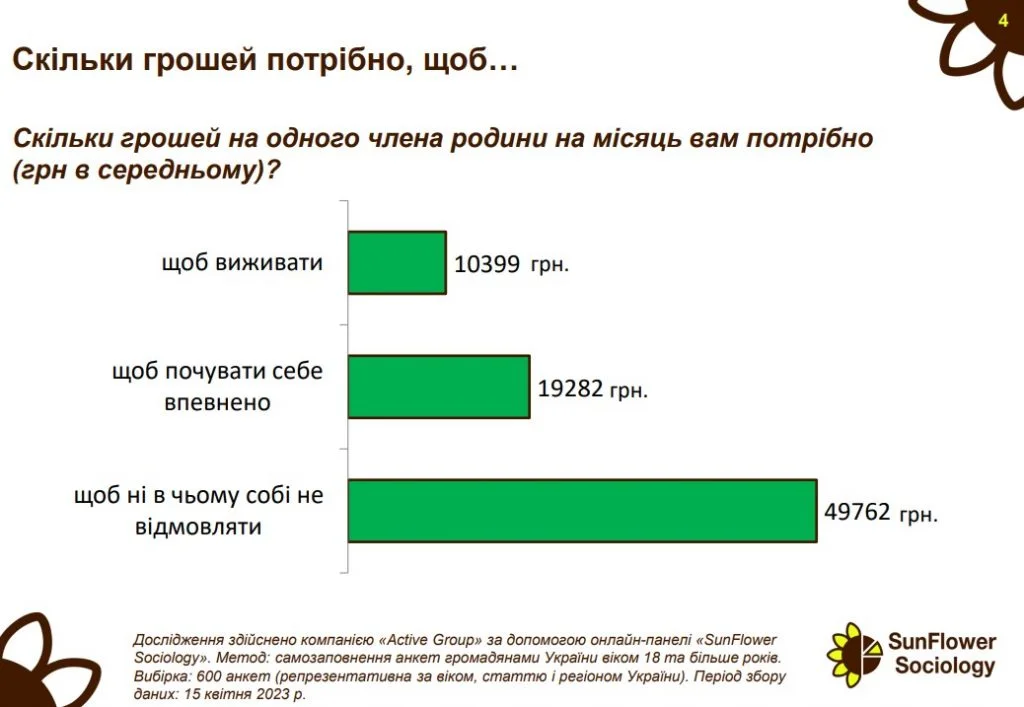 Українці розповіли соціологам, якої суми грошей на місяць для них було б достатньо, щоб виживати, щоб почуватися комфортно та назвали суму, яка б дозволила ні в чому собі не відмовляти.
