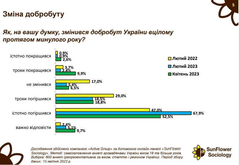 71% опитаних заявили, що за рік їхній фінансовий стан погіршився. Більше половини респондентів (52,5%) зазначили, що їхній рівень життя погіршився суттєво. Про покращення у фінансовому плані заявили 12,5% опитаних українців (істотне покращення – 2,6%).