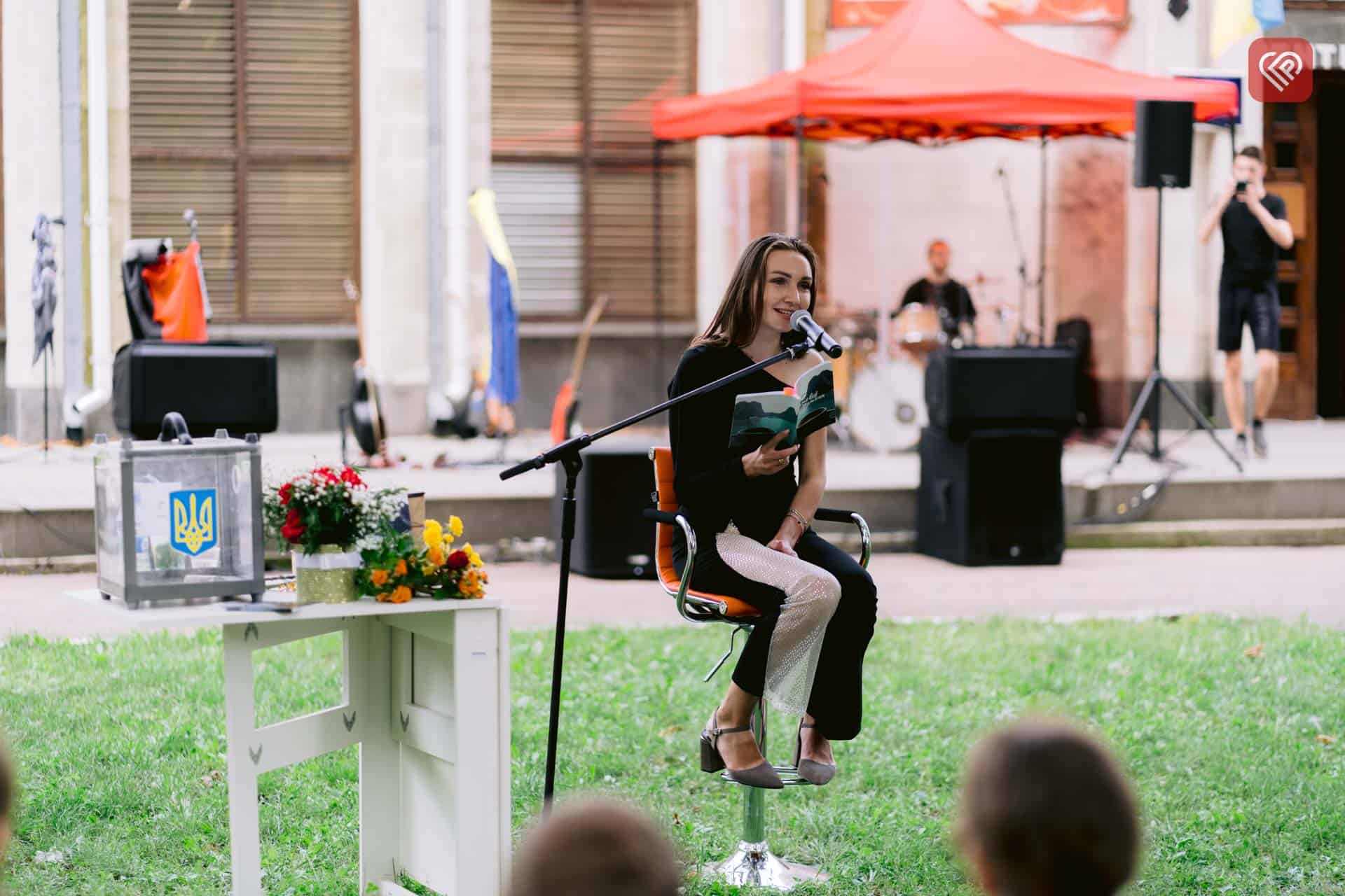 Близько 17 години напроти Центру культури і мистецтв почали збиратися охочі, щоб насолодитися віршами та музикою. Для них поетеса Вікторія Цьома читала свої вірші та ділилася роздумами про життя. Вона неодноразово повторювала, що ніколи не треба опускати руки, а завжди треба рухатись вперед. У її книзі “Цитатник життя” зібрано мотиваційну, любовну поезію, а також вірші про юність, подорожі та війну.