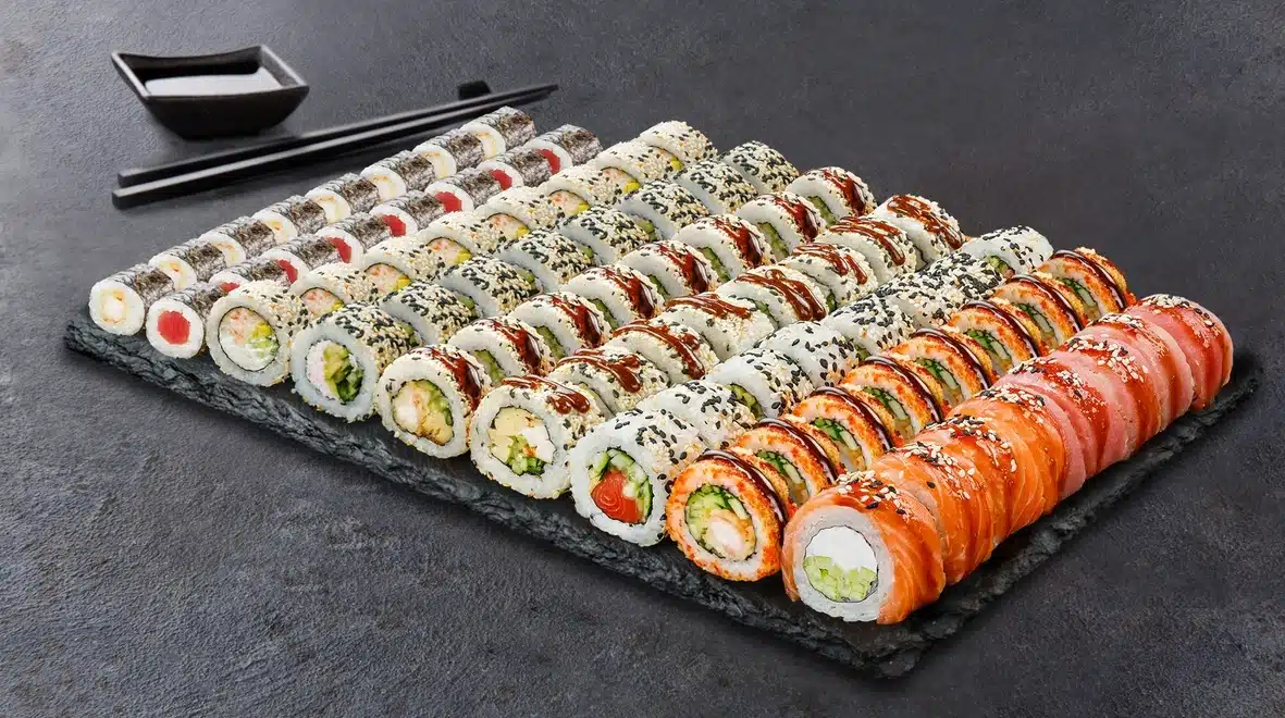 Великий святковий сет, що включає понад 9 позицій: Філадельфії, Каліфорнії, Кранчі, Макі.