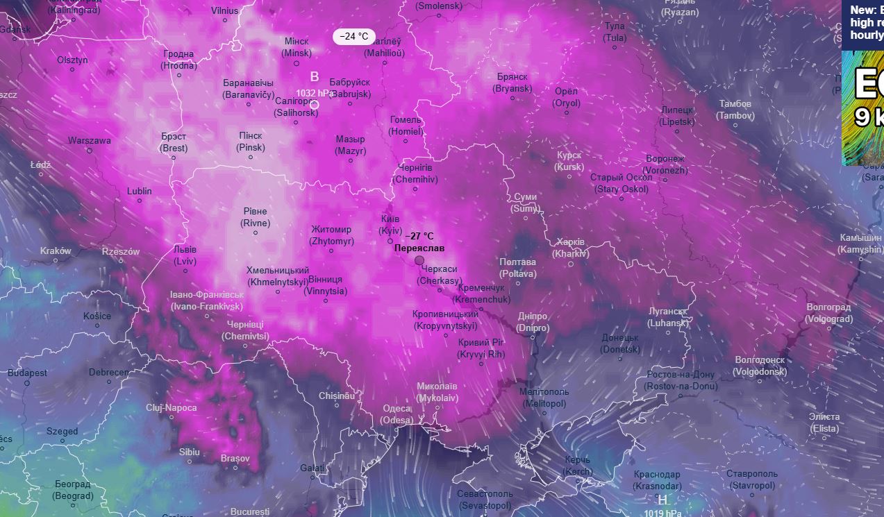 Синоптики прогнозують, що в нічний період – орієнтовно з 01:00 до 04:00 – температура повітря може відчуватися як -27°. Починаючи з 07:00 ранку, показники коливатимуться в межах -23…-24°.