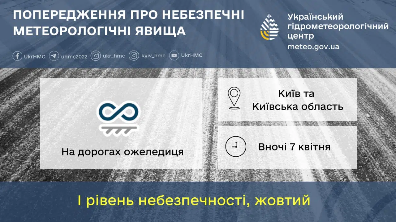 В Українському гідрометцентрі попередили про ожеледицю на дорогах вночі 7 квітня. Через це оголошено І рівень небезпечності, жовтий.