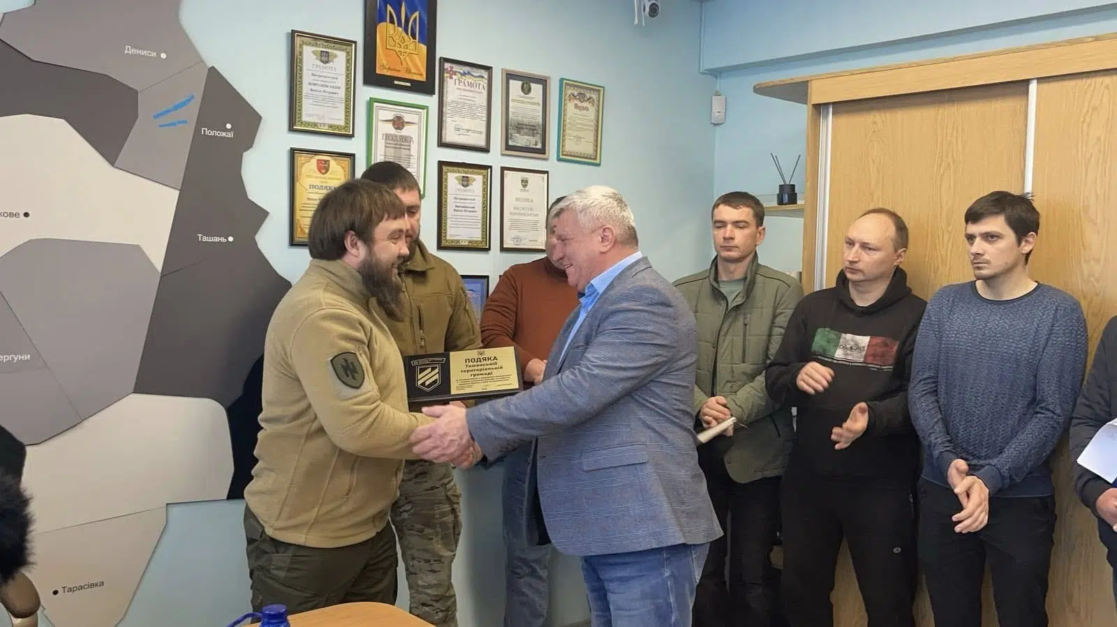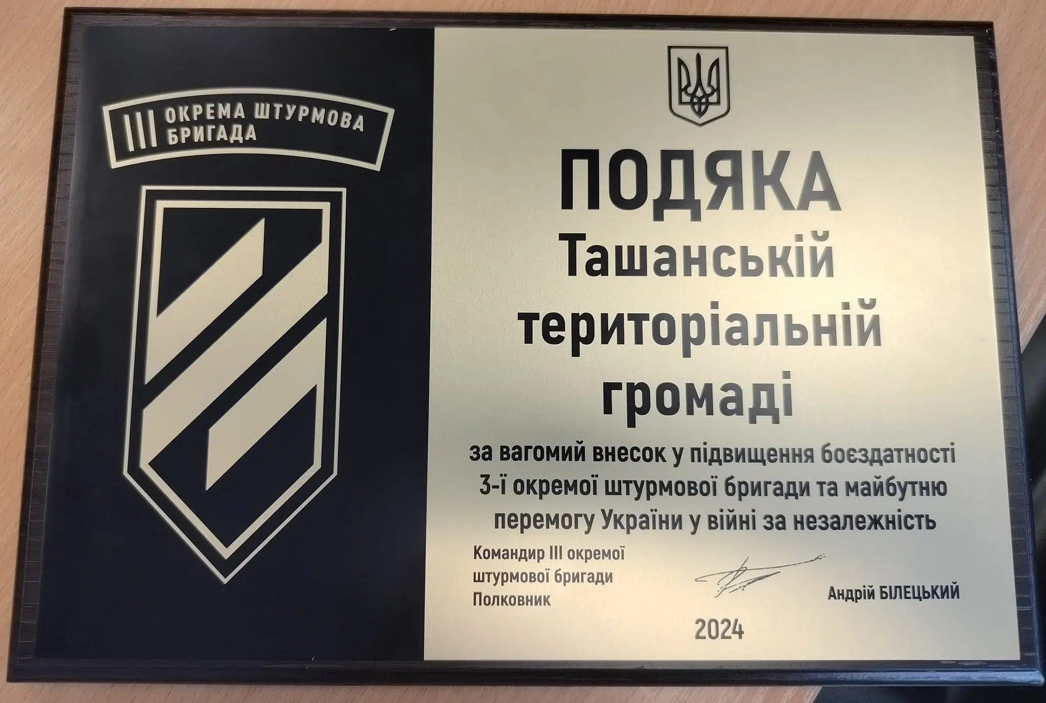 Вадим Кудіяров, керівник відділу цивільно-військового співробітництва 3-ї окремої штурмової бригади передав подяку від командира Андрія Білецького голові Ташанської сільської ради Василю Вовчанівському. Про це пишуть на сторінці громади.