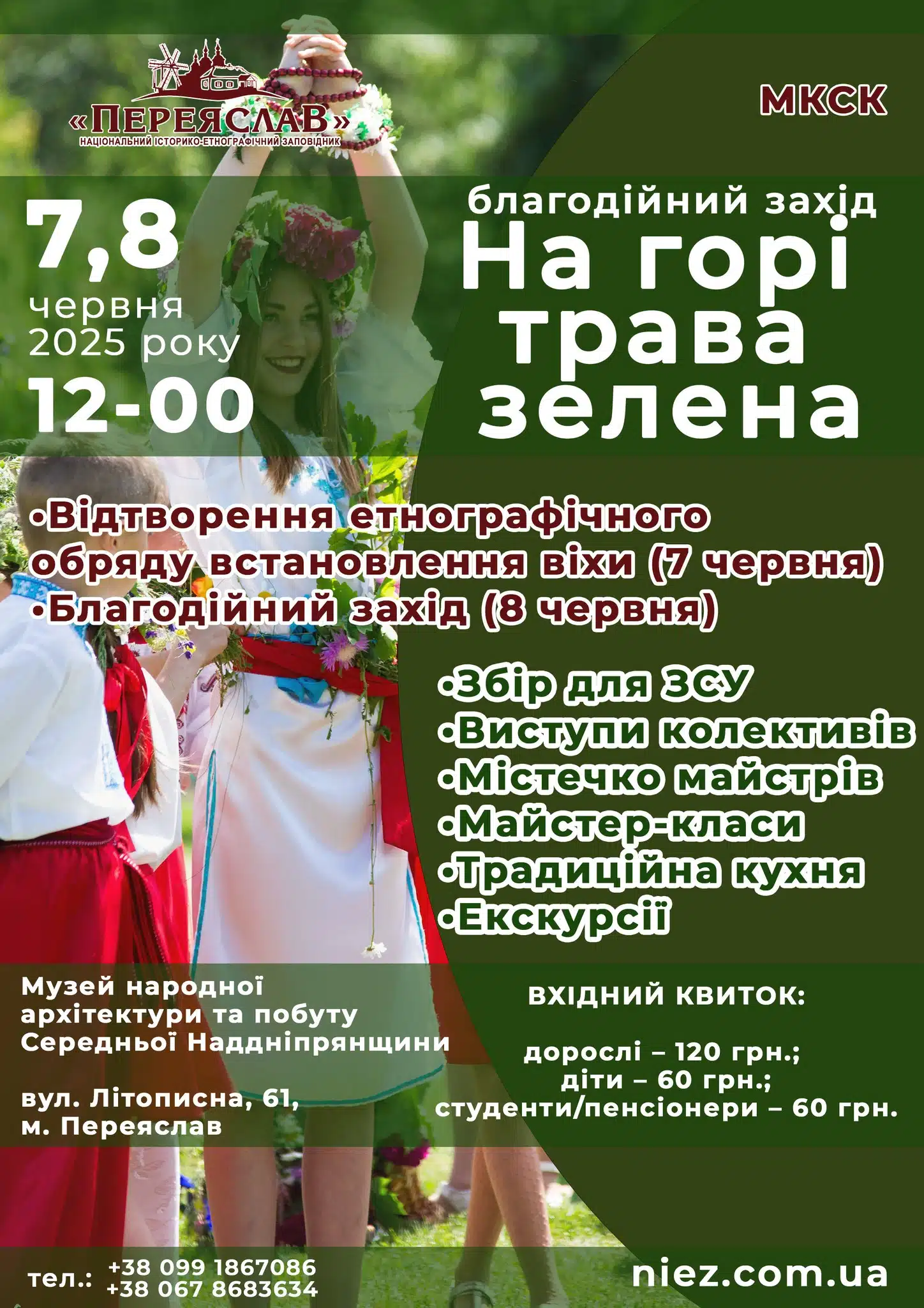 До свята Трійці 7 та 8 червня у Музеї народної архітектури та побуту Середньої Наддніпрянщини відбудеться дводенний захід під назвою «На горі трава зелена», повідомили на сторінці НІЕЗ «Переяслав». Під час святкової програми відбуватиметься збір коштів на потреби ЗСУ, передає Proslav.