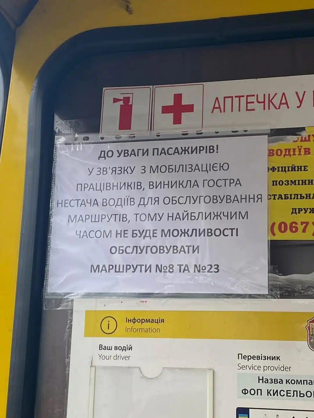 «До уваги пасажирів! У зв’язку з мобілізацією працівників виникла гостра нестача водіїв для обслуговування маршрутів, тому найближчим часом НЕ БУДЕ МОЖЛИВОСТІ ОБСЛУГОВУВАТИ МАРШРУТИ №8 та №23».