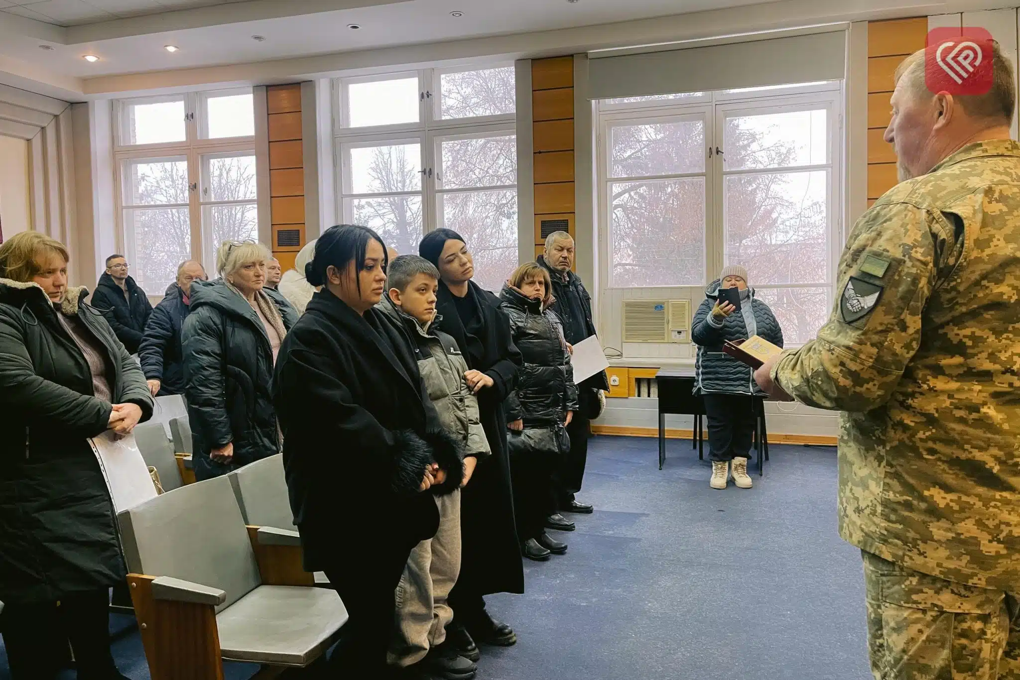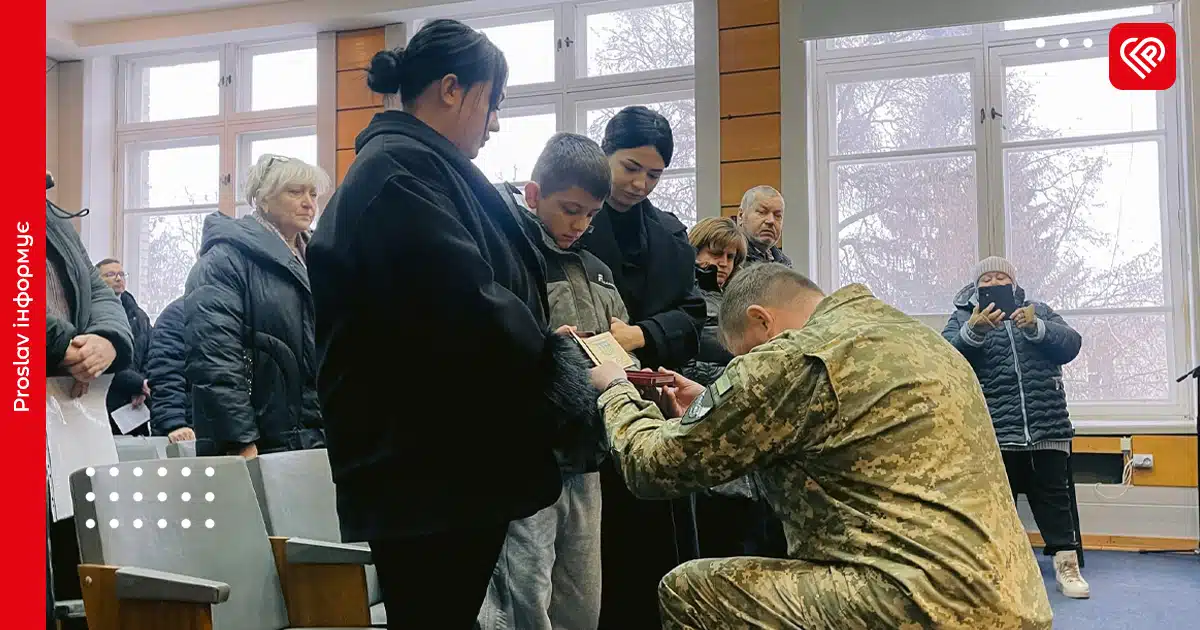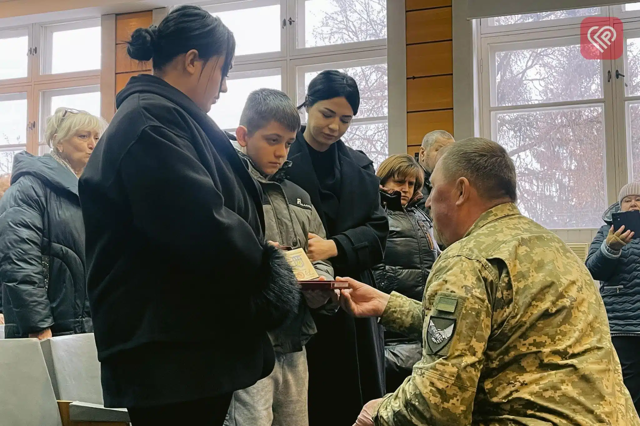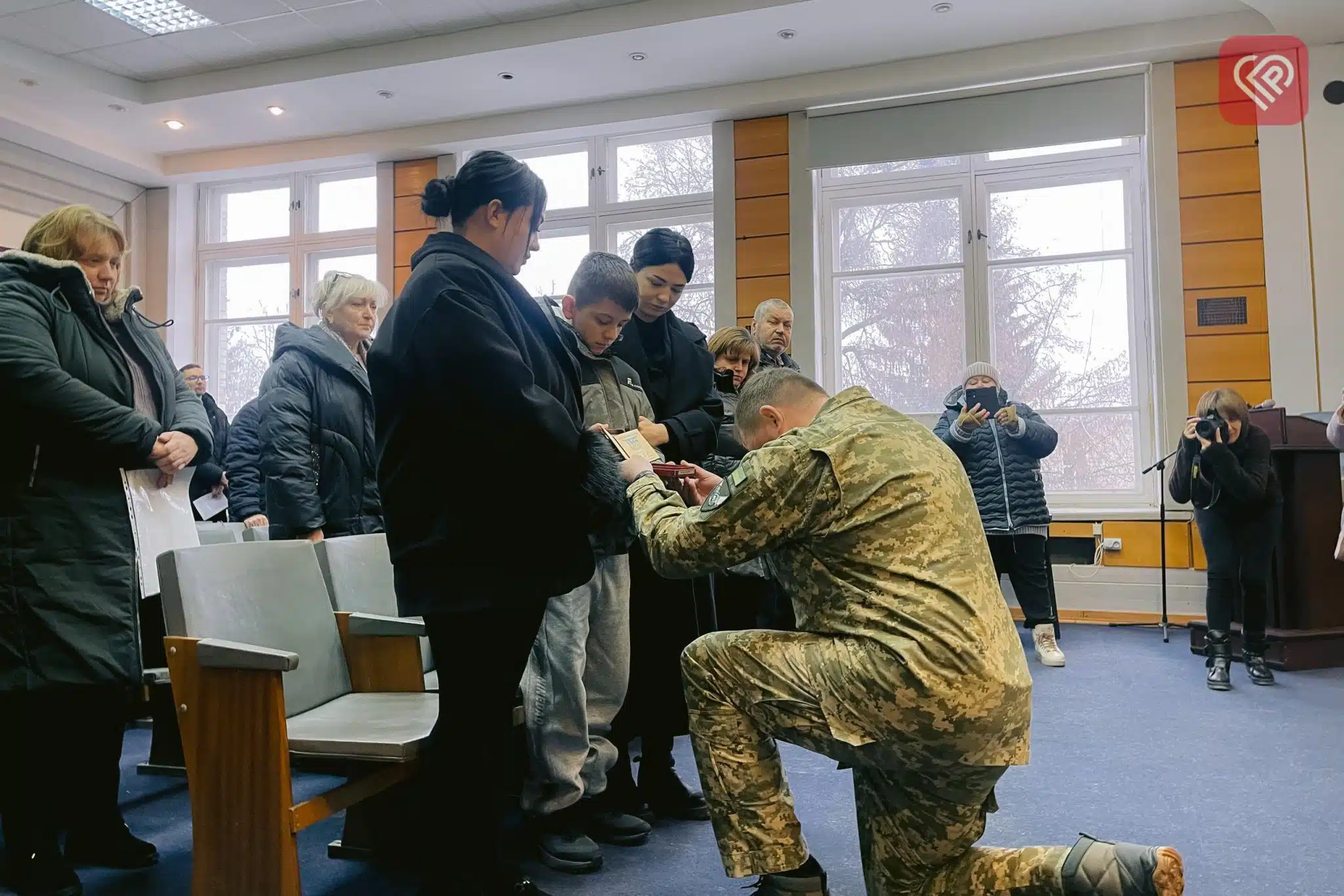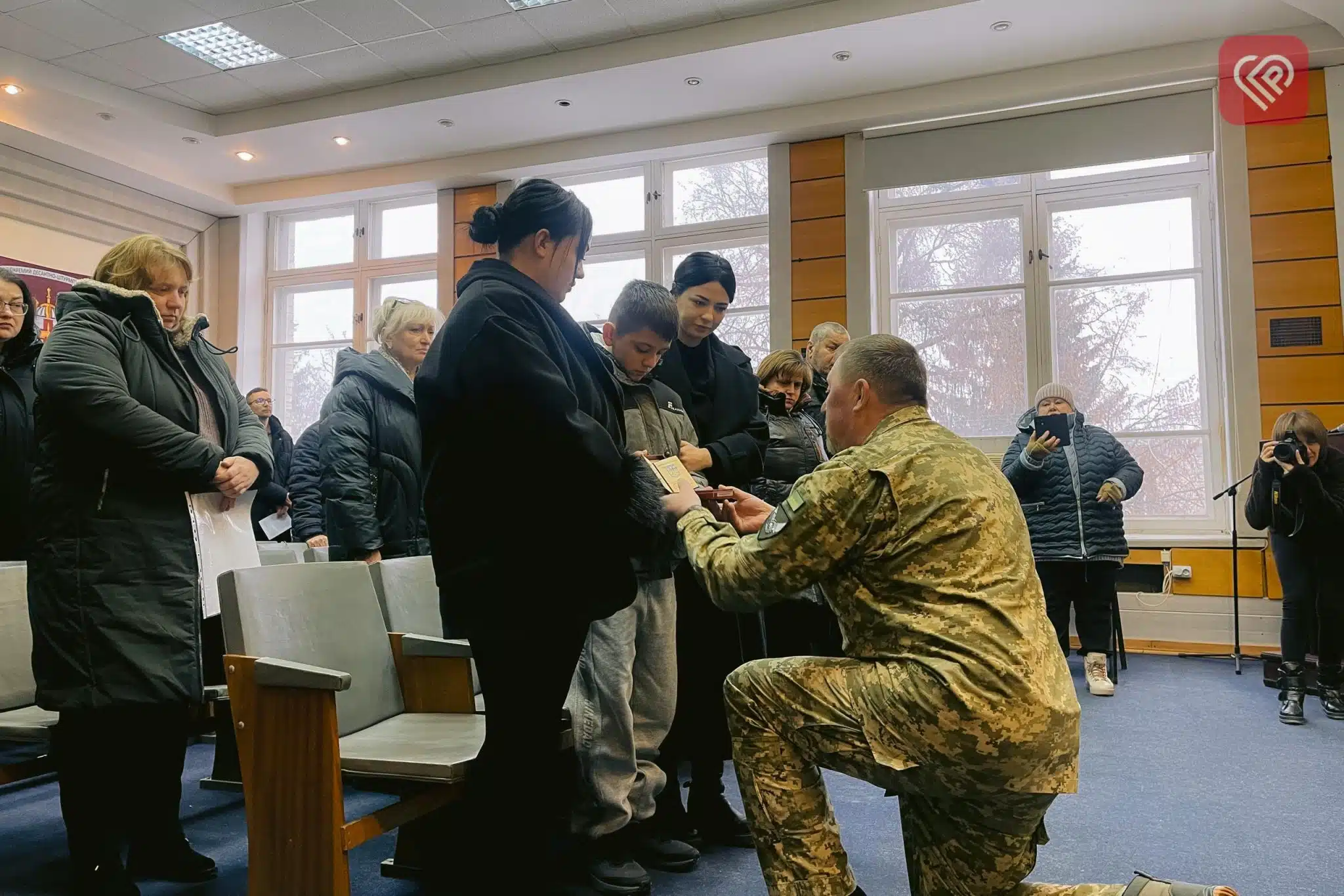 Державну нагороду донькам загиблого Героя – Аліні та Христині, а також його онуку Микиті вручив капітан Андрій Шаповал, начальник відділення цивільно-військового співробітництва 1 відділу Бориспільського РТЦК та СП.