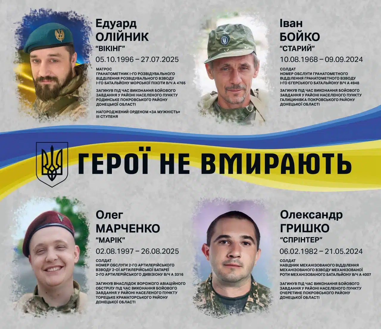 - Олійник Едуард Анатолійович, матрос, позивний «Вікінг» – загинув 27 липня 2025 року під час виконання бойового завдання в районі Родинського Донецької області.