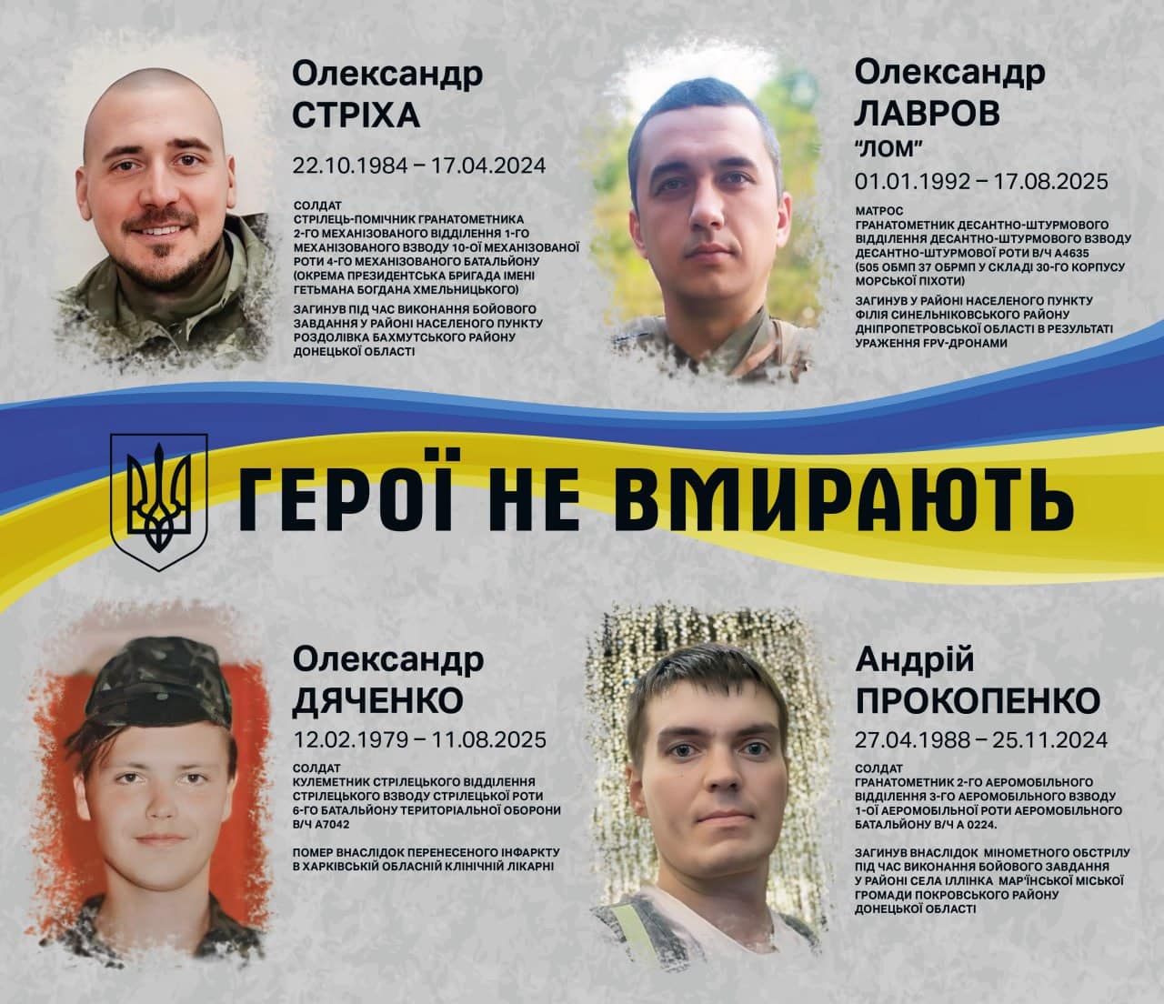 - Марченко Олег Анатолійович, солдат, позивний «Марік» – загинув 26 серпня 2025 року під час ворожого авіаобстрілу поблизу Торецька Донецької області.