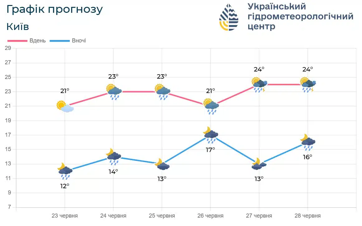 За даними гідрометцентру, з 24 по 28 червня на Київщині погода дотримуватиметься принципу «жодного дня – без дощу». Синоптики зазначають, що опади будуть у різні частини доби і матимуть короткочасний характер, іноді – у супроводі гроз.