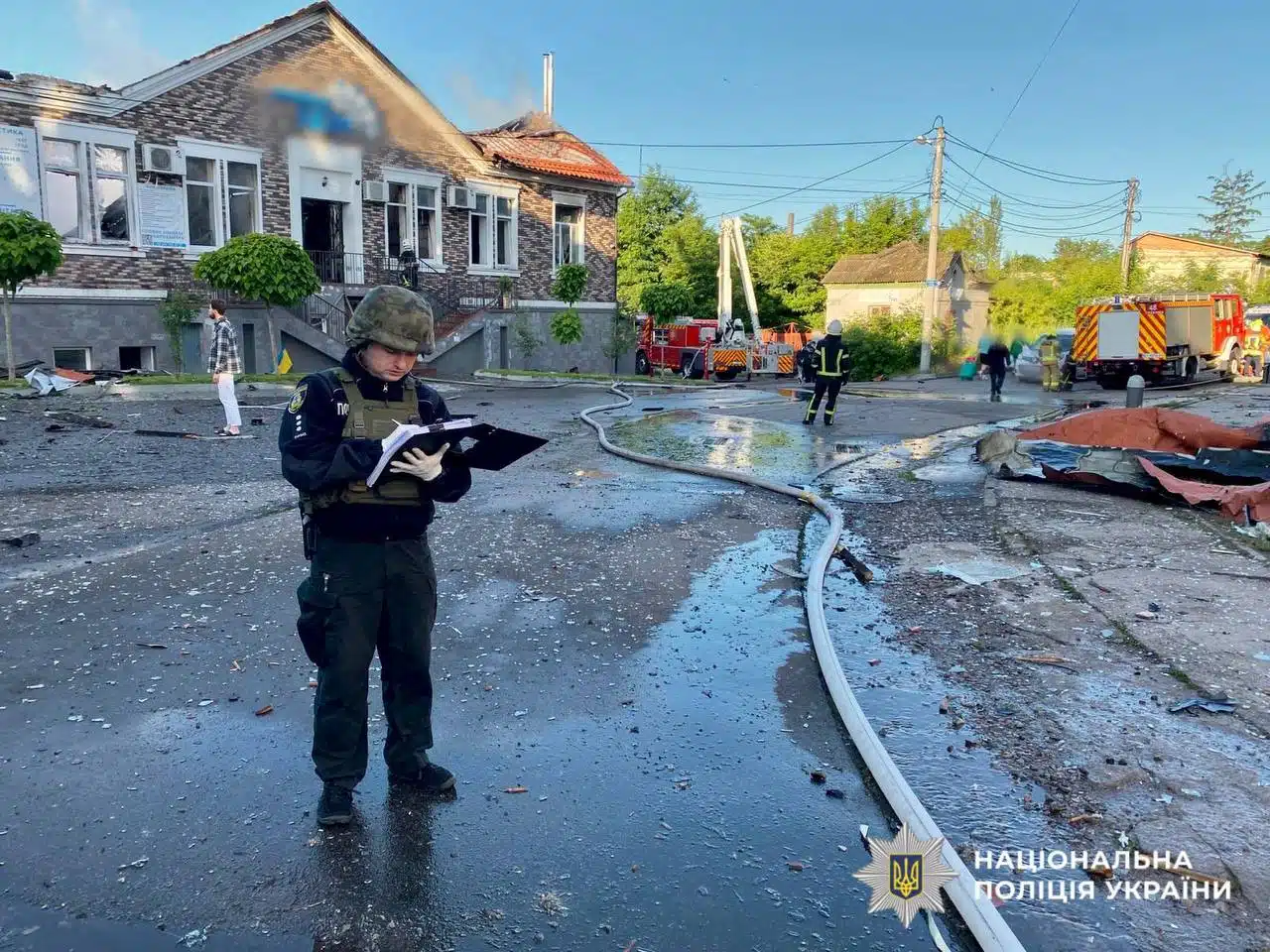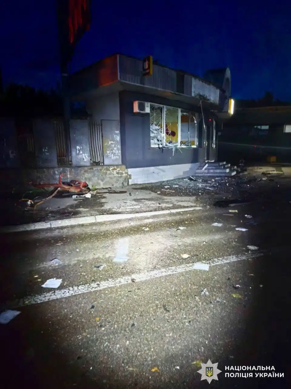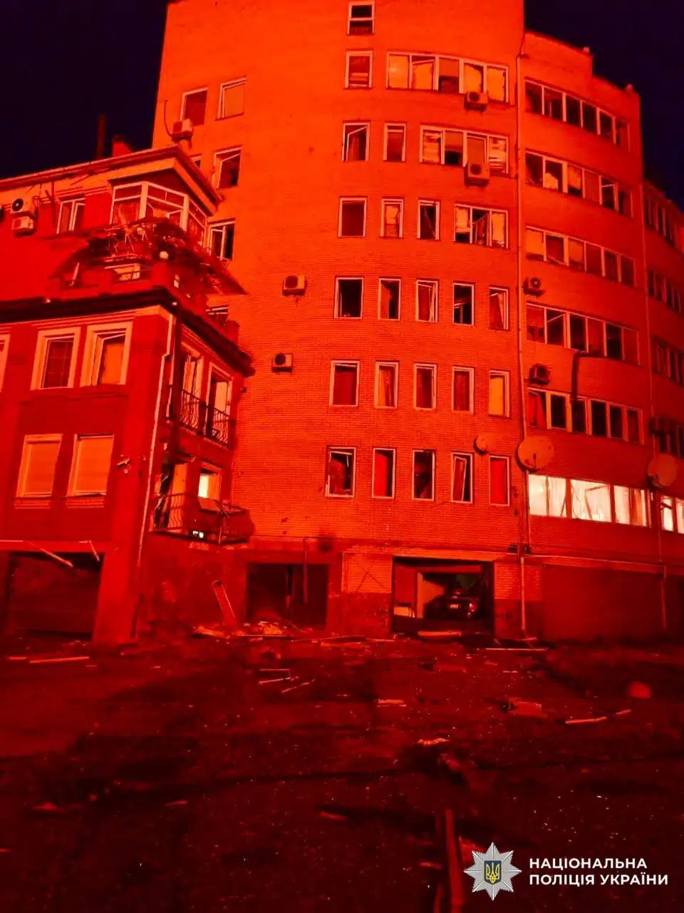 За повідомленням поліції Київщини, станом на 07:40 у Білоцерківському районі пошкоджені чотири приватні будинки, багатоквартирний будинок та підприємство. Крім того, зруйнована будівля готелю, в якій був розміщений медичний заклад.
